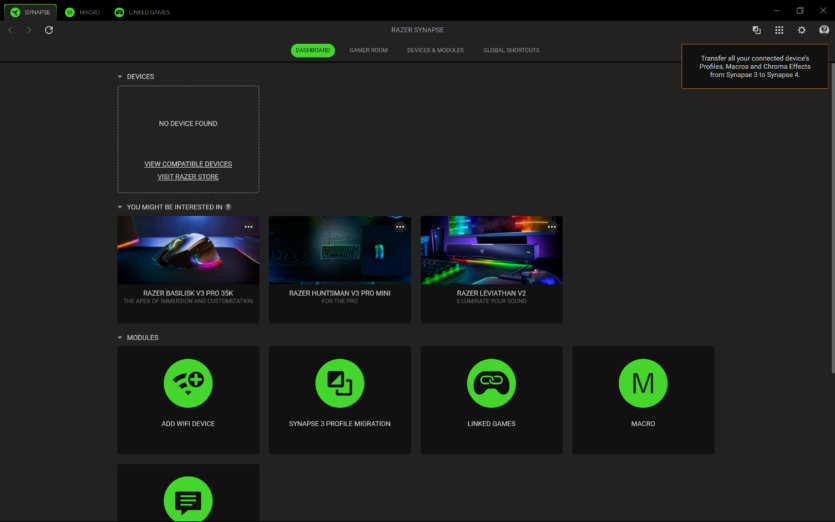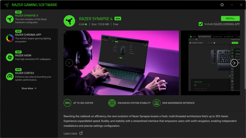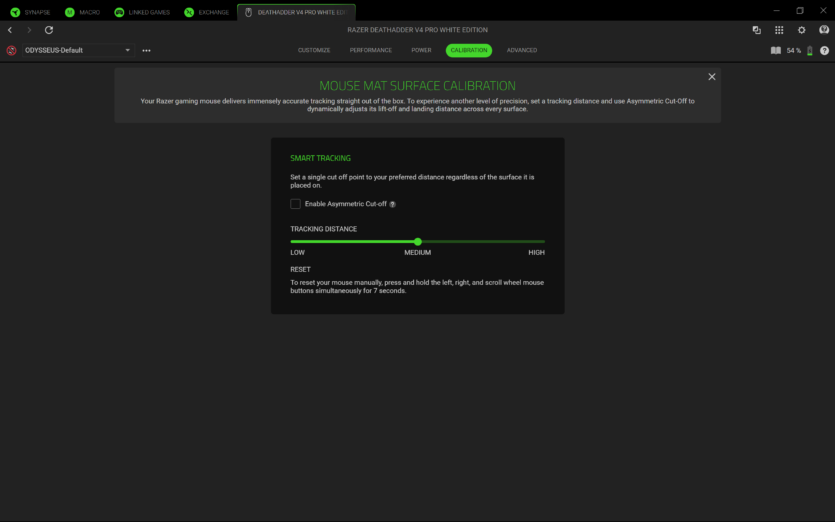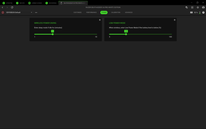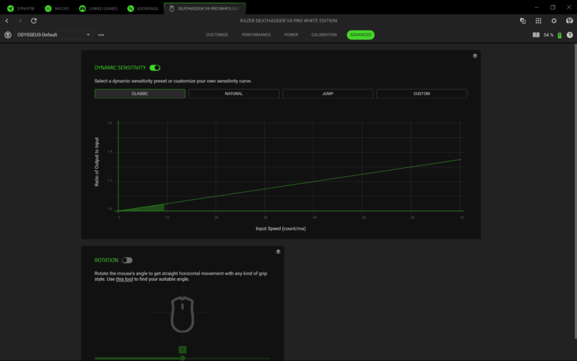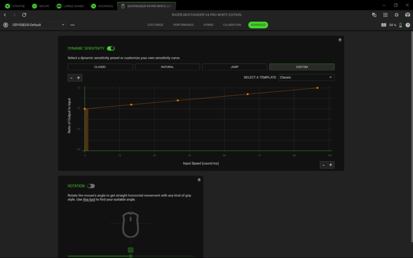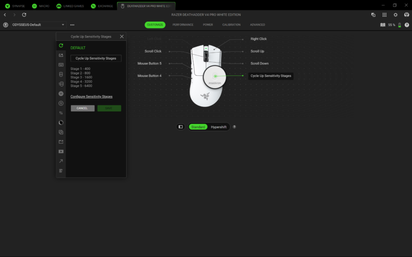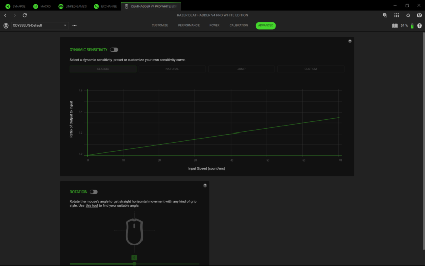 Для налаштування Razer DeathAdder V4 Pro використовується програмне забезпечення Razer Synapse 4. Воно дозволяє створювати профілі, змінювати DPI, налаштовувати частоту опитування та параметри підняття миші.
