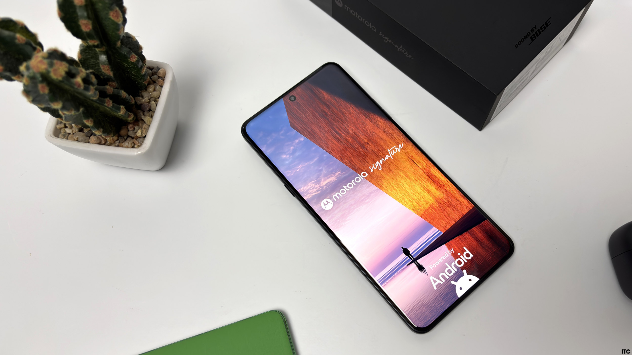 Співвідношення екрана до корпусу заявлене на рівні 95,23%. Рамки Motorola Signature дійсно мінімальні й симетричні, а фронтальна камера — акуратний отвір по центру. Візуально дисплей займає майже всю передню панель.