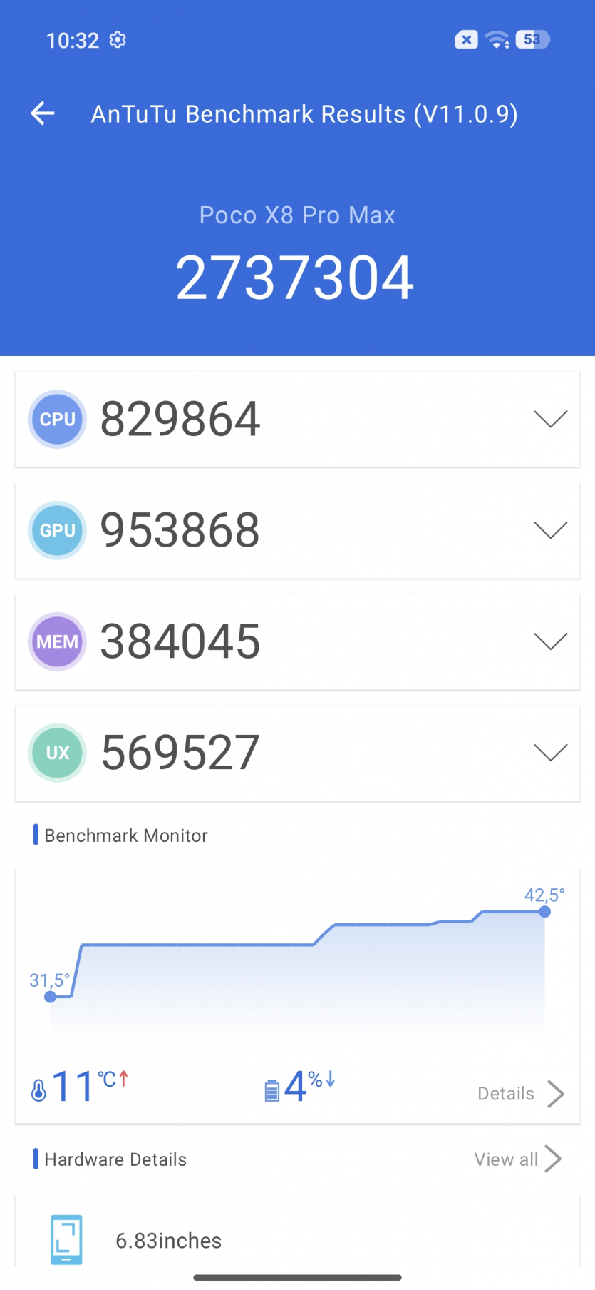 POCO X8 Pro Max отримав 6,83-дюймовий AMOLED-дисплей. Його роздільна здатність 1,5K (2772×1280 точок), а щільність пікселів складає 447 ppi. Також маємо адаптивні 120 Гц, підтримку HDR10+ та 12-бітну глибину кольору. Останнє дає 68 мільярдів кольорів, які реально помітні при перегляді фото та відео у якісному контенті.