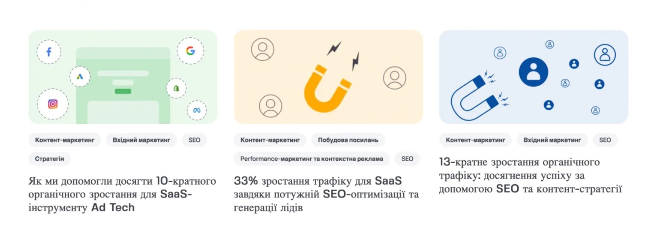 Один із кейсів агенції — робота з SaaS-проєктом у сфері IPTV, де команда побудувала маркетинговий відділ, запустила SMM та аналітику, email-розсилки, Facebook і Google Ads, рекламні креативи й тексти. У результаті показники продажів зріс із 500 до 12 тис. на місяць.