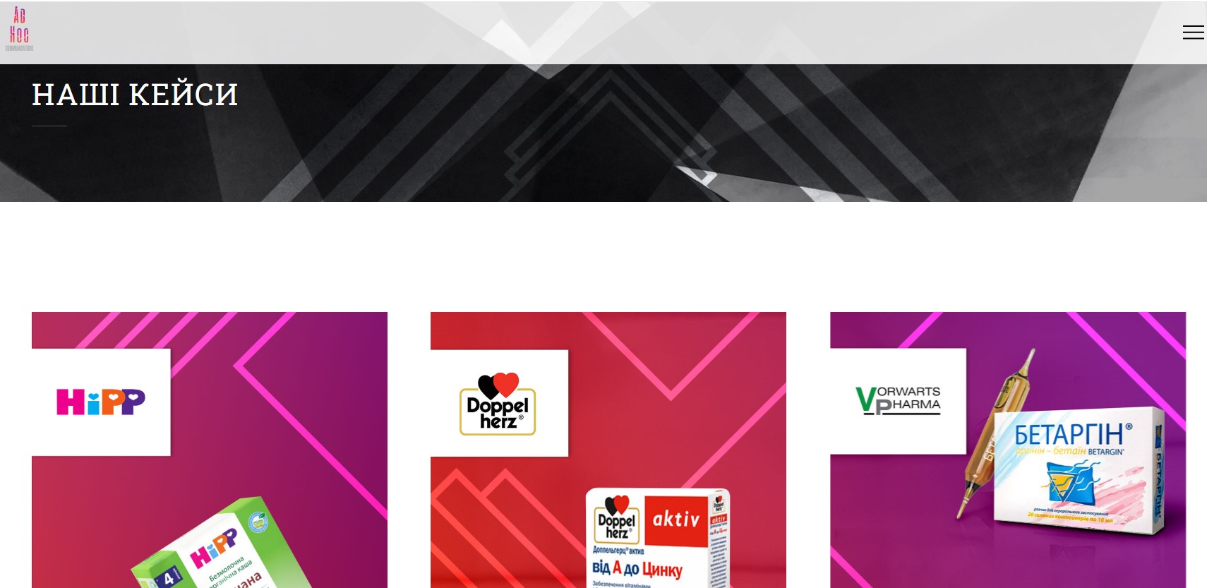 Компанія реалізувала понад 1000 проєктів. Серед клієнтів — Hipp, Atlant, IdeaBank, Asus, Joom та інші. Наприклад, у маркетинг-кампанії для Hipp команда Ad-hoc мала зміцнити позицію бренду та стимулювати продаж акційних товарів. Щоб досягти мети, вона запустила digital-кампанію з високим рівнем таргетування на цільову аудиторію та залученням конверсійних інструментів: Programmatic, Google Ads, Google search, Facebook, Instagram. Результат кампанії: +49% кліків, +25% цільового охоплення, +60% показів реклами.