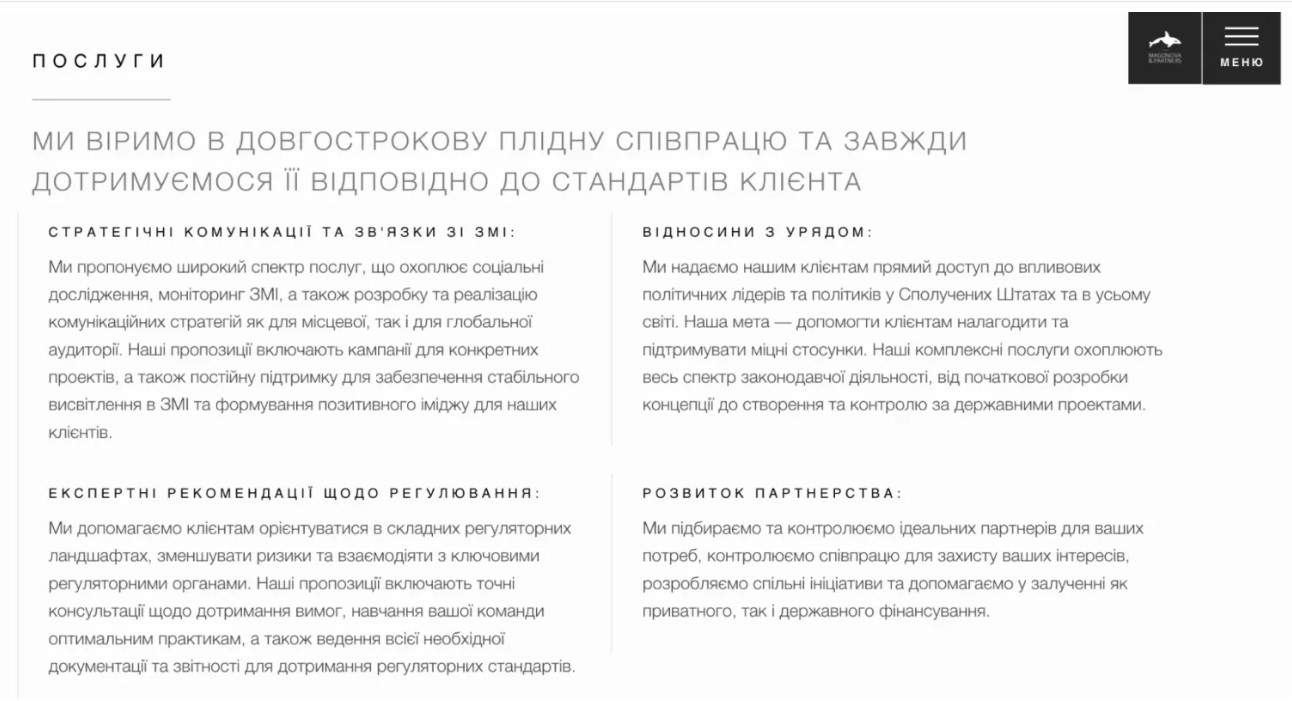Агенція, що працює з B2B та технологічними компаніями по всьому світу. Спеціалізується на публікаціях у топових світових медіа, організації публічних виступів, побудові особистого бренду засновників компаній, стратегічному комплексному супроводжені. Забезпечують виходи в ТОП‑медіа, на подкастах та конференціях на кшталт New York Tech Week, Web Summit, European Economic Congress.