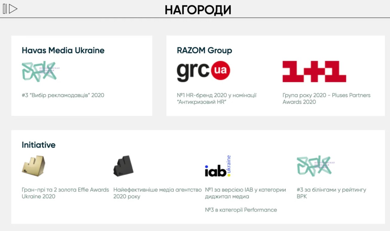 RAZOM GROUP — це рекламно-комунікаційний холдинг, який працює понад 26 років. До його складу входять медіаагенції Initiative, UM Ukraine, Havas Media Ukraine, Cameo, IT-хаб MadLab, агенція performance-маркетингу MORE і AI-агенція для рекламних кампаній AICON.