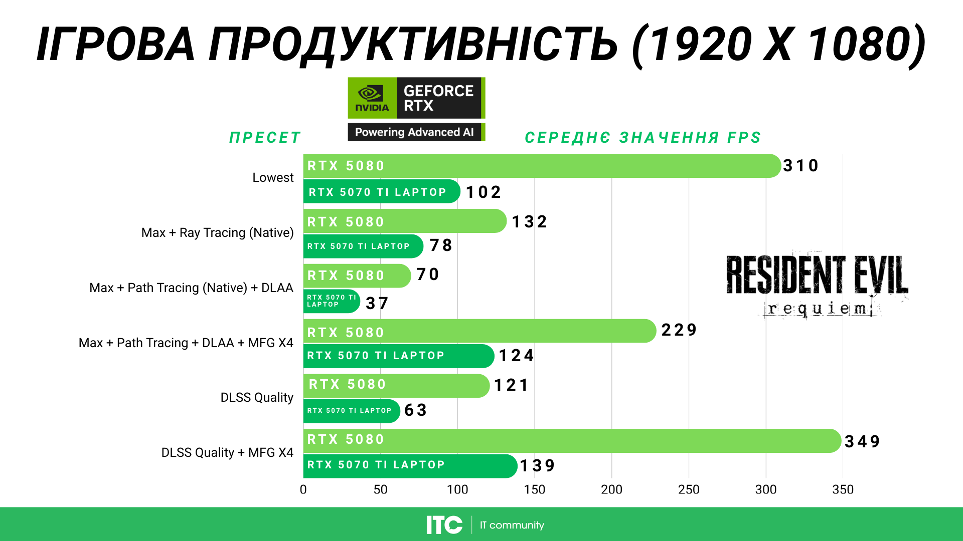 Resident Evil Requiem — технологічно надзвичайно вимоглива гра, яка одразу ставить систему під максимальне навантаження. У 1080p RTX 5080 легко тримає високий FPS на більшості пресетів, проте повний path tracing без DLSS і Multi Frame Generation вже створює помітне падіння продуктивності. Мобільна RTX 5070 Ti у 1080p здатна забезпечити прийнятні 60+ FPS з PT лише з апскейлом або генерацією кадрів.