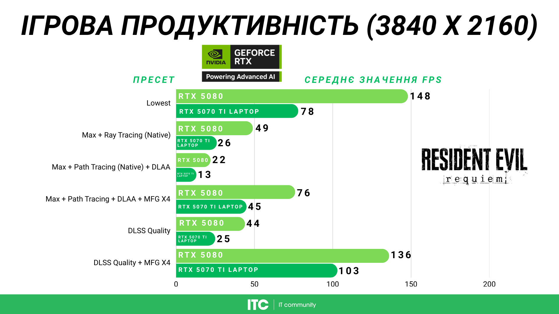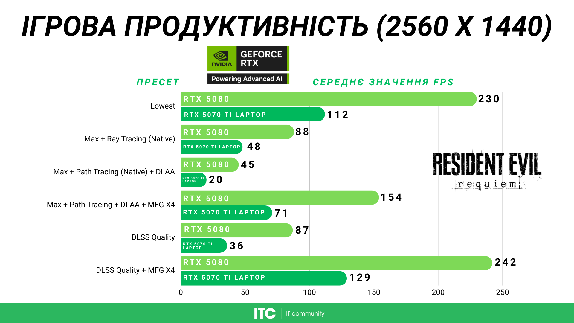 На Lowest RTX 5080 у Resident Evil Requiem показує 230 FPS, а ноутбучна RTX 5070 Ti — 112 FPS. Цікаво, що мобільна карта тут навіть виглядає краще, ніж у 1080p.
