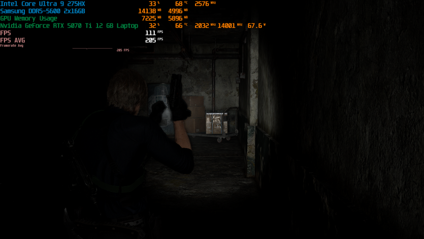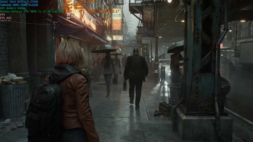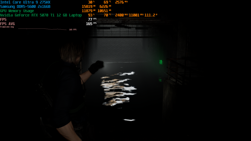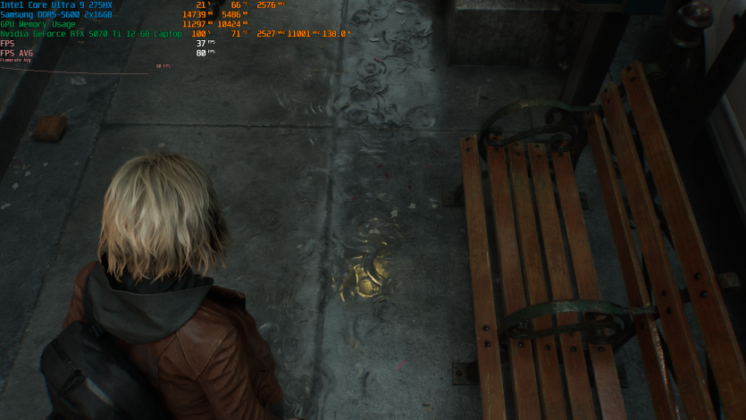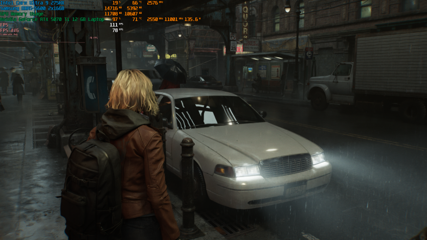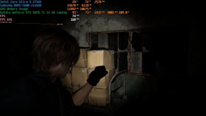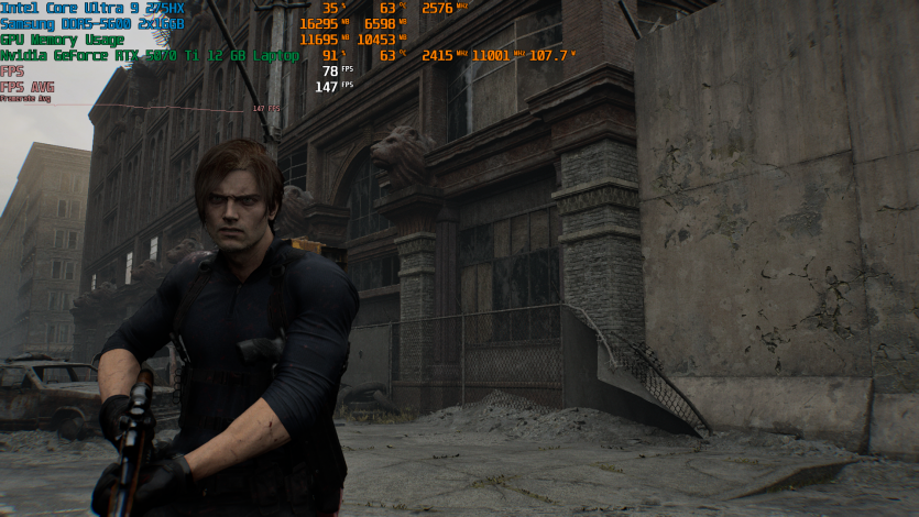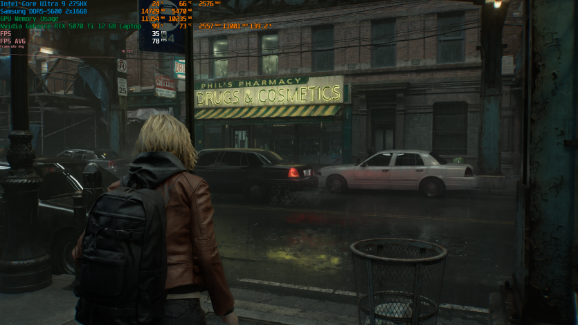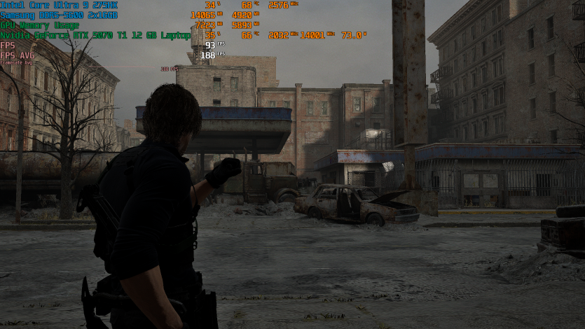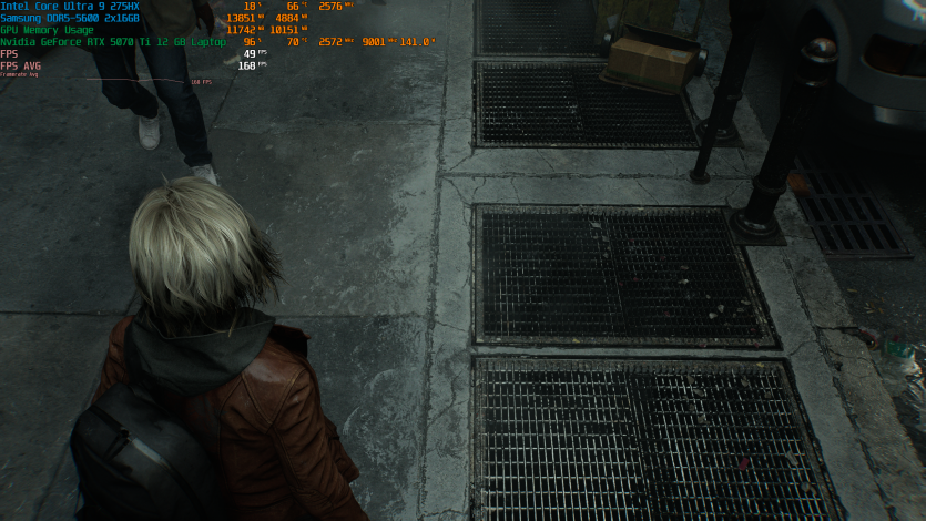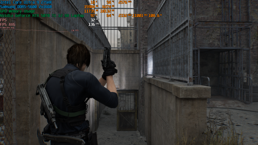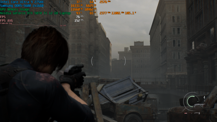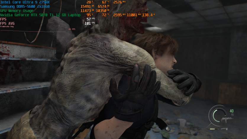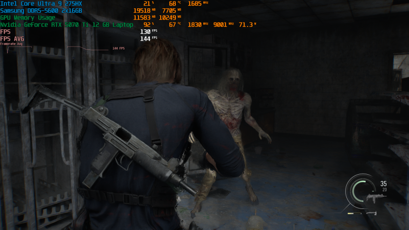 Запустивши Resident Evil Requiem, і обравши пресет DLSS Quality + MFG X4, маємо 136 FPS на десктопі та 103 FPS на ноутбуці. Для мобільної 5070 Ti це сценарій, який робить 4K реалістичним, а не номінальним режимом.