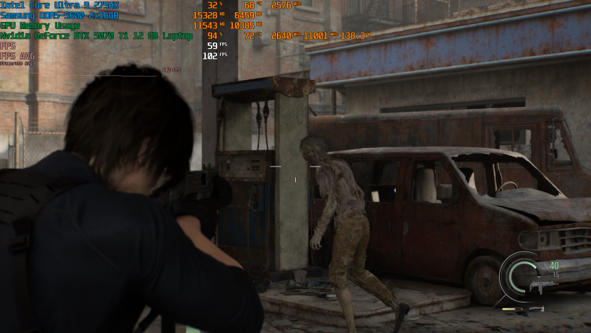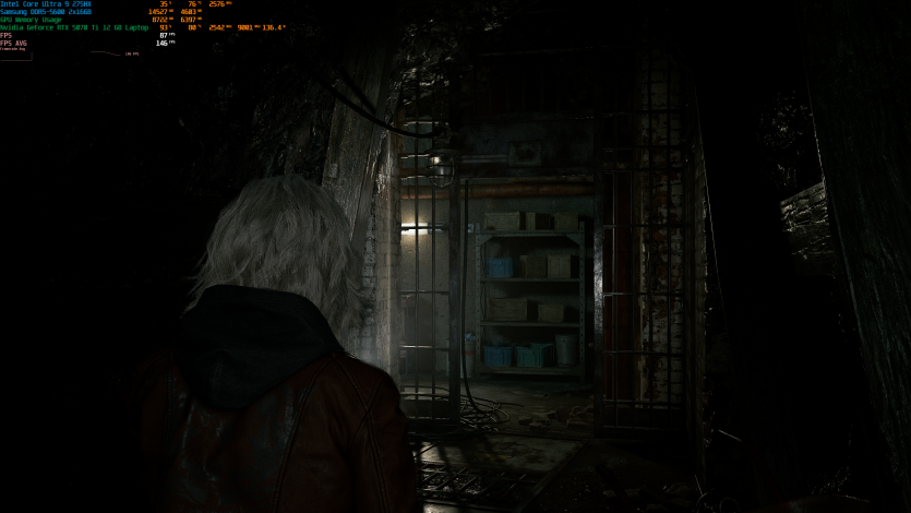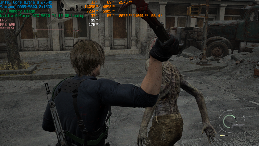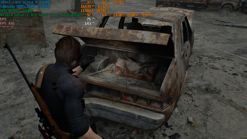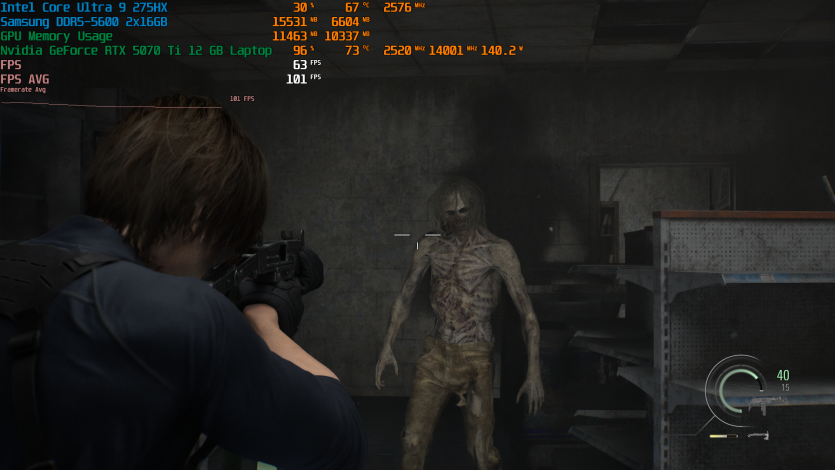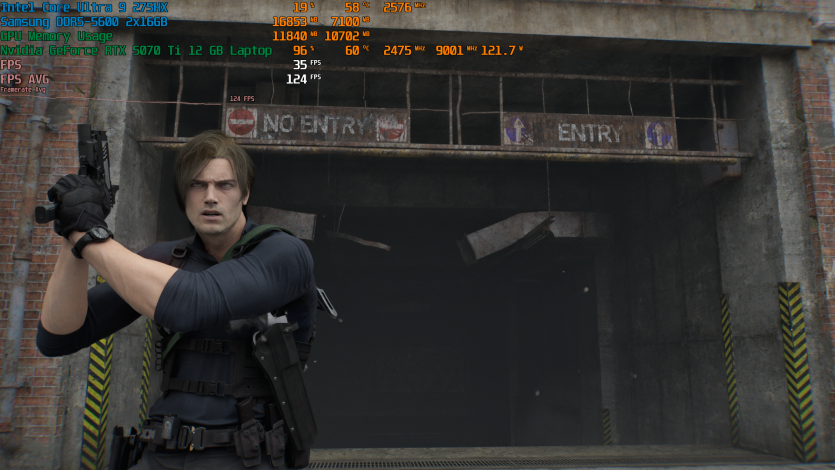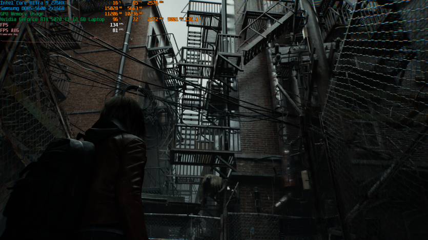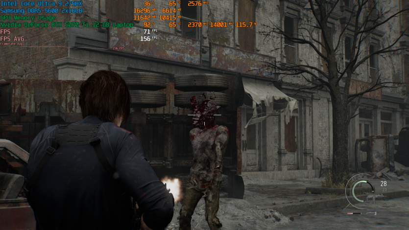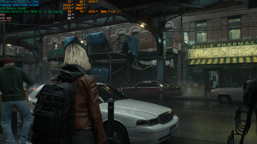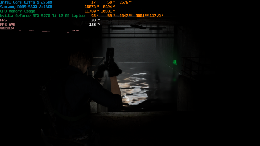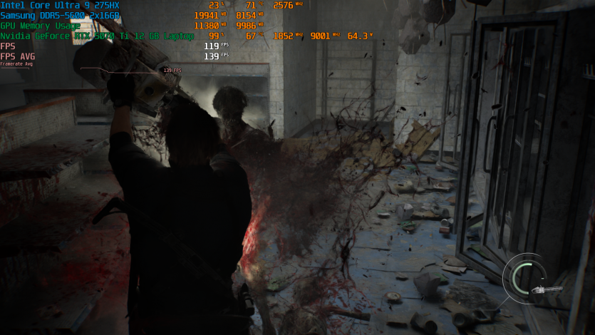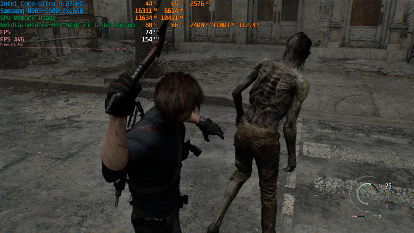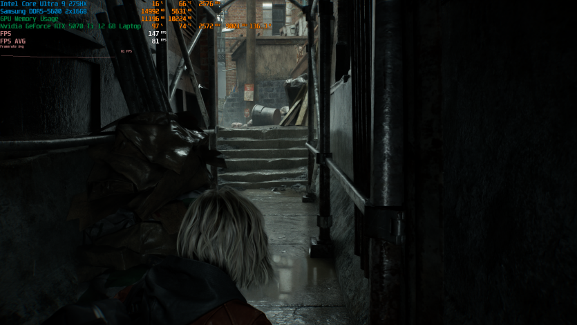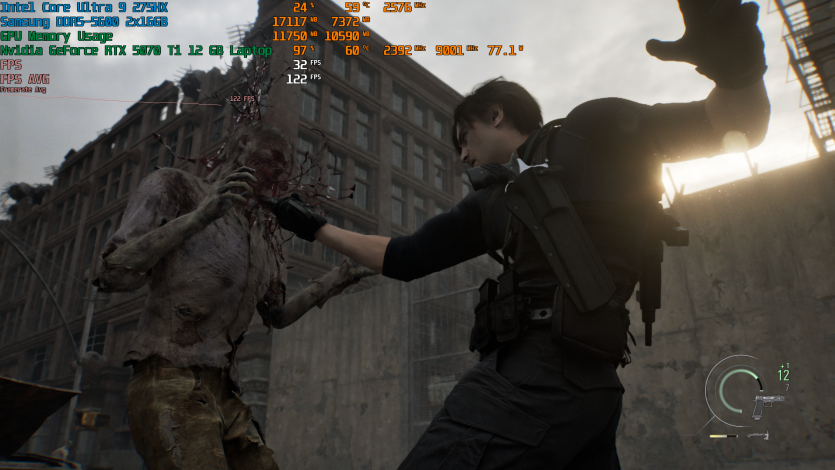 Запустивши Resident Evil Requiem, і обравши пресет DLSS Quality + MFG X4, маємо 136 FPS на десктопі та 103 FPS на ноутбуці. Для мобільної 5070 Ti це сценарій, який робить 4K реалістичним, а не номінальним режимом.