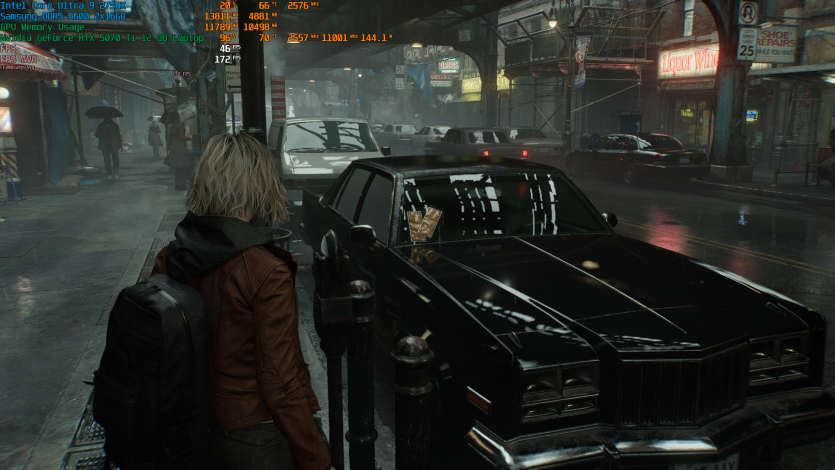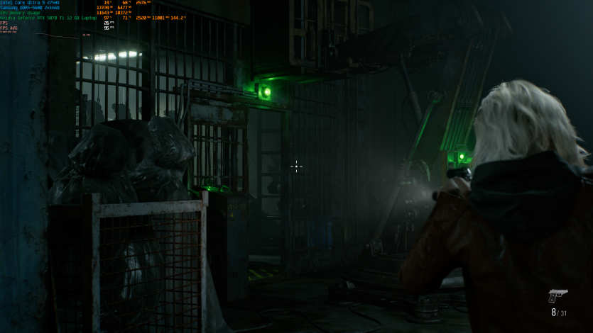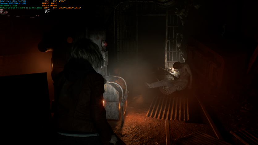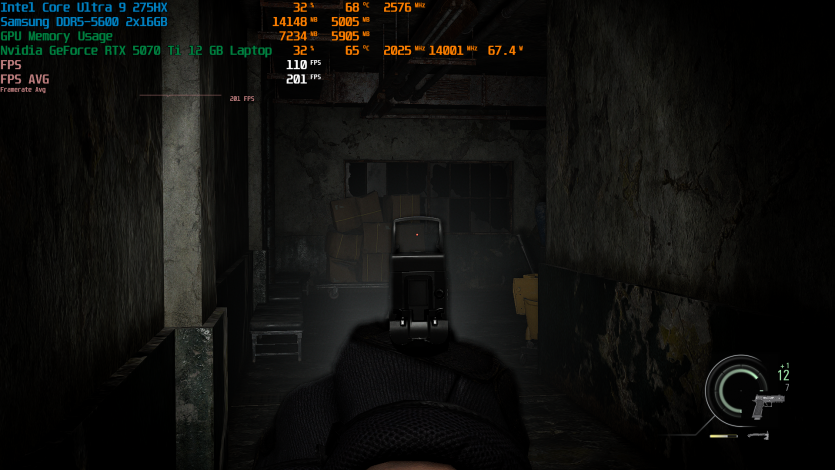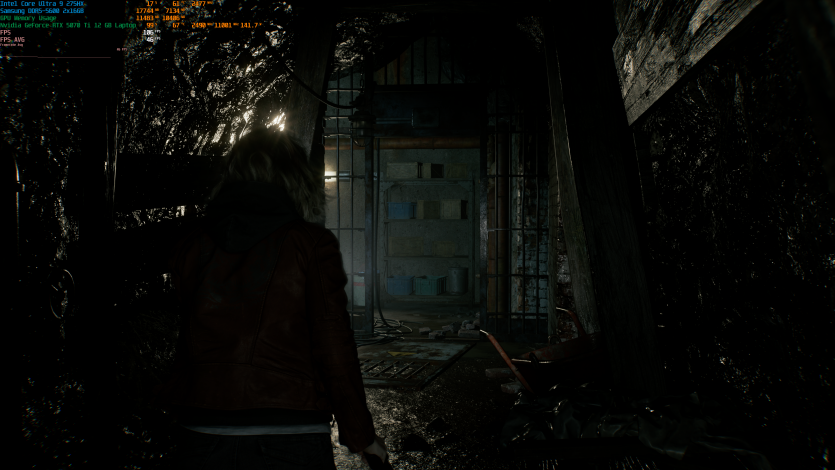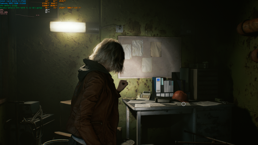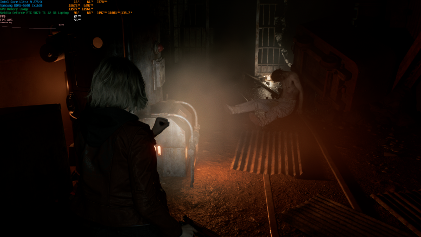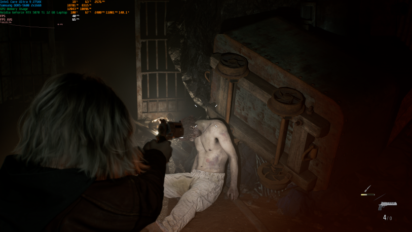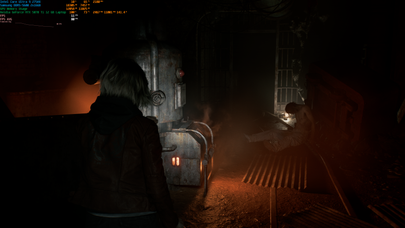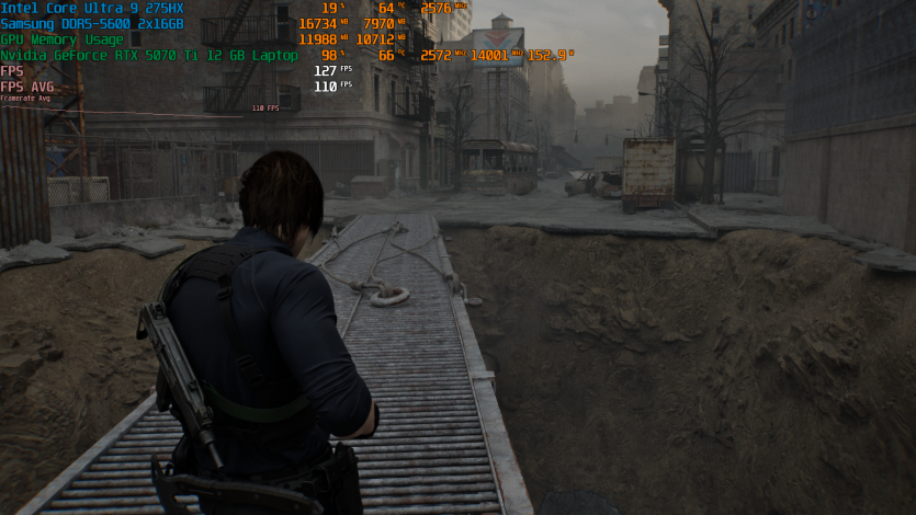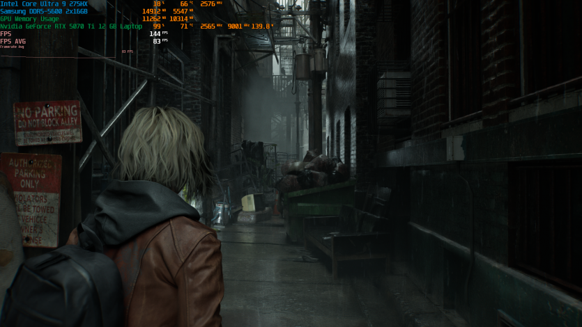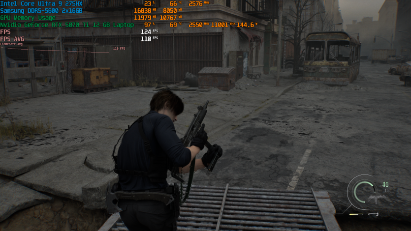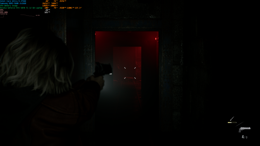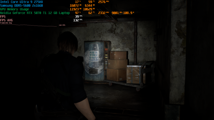 Запустивши Resident Evil Requiem, і обравши пресет DLSS Quality + MFG X4, маємо 136 FPS на десктопі та 103 FPS на ноутбуці. Для мобільної 5070 Ti це сценарій, який робить 4K реалістичним, а не номінальним режимом.