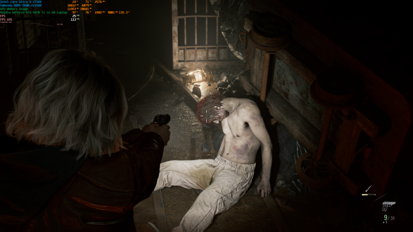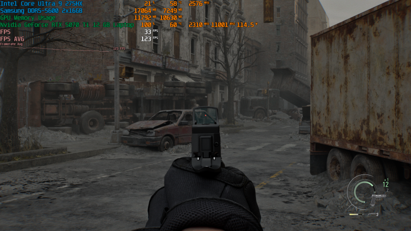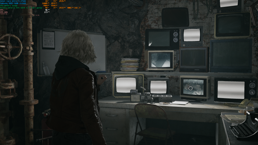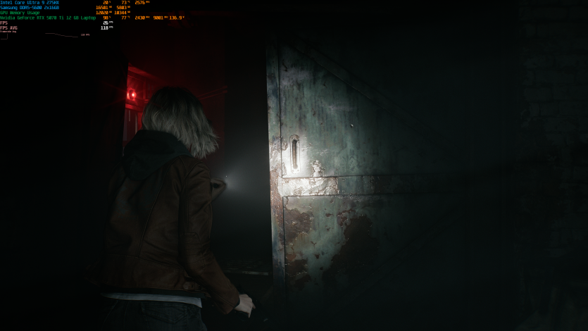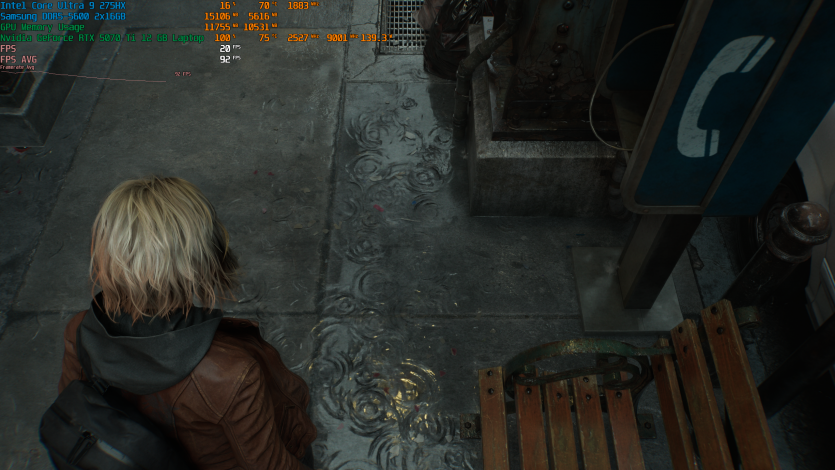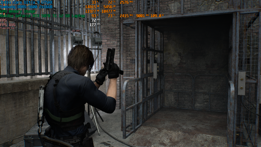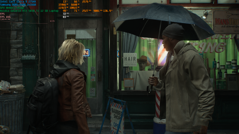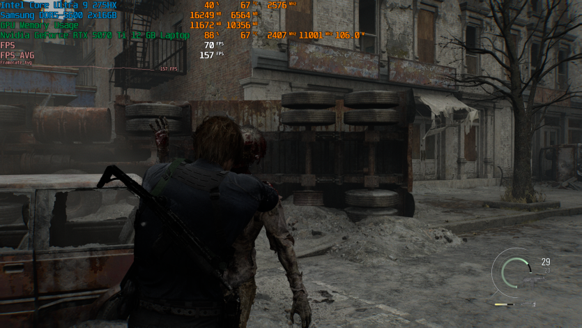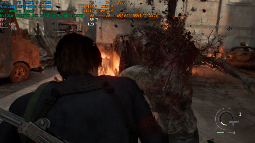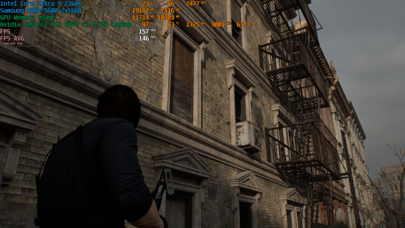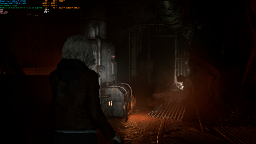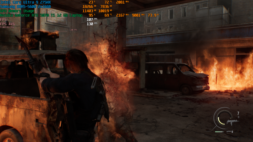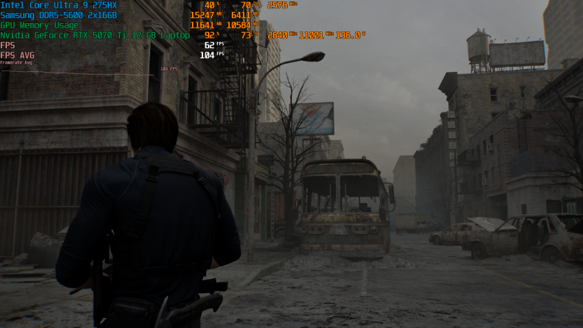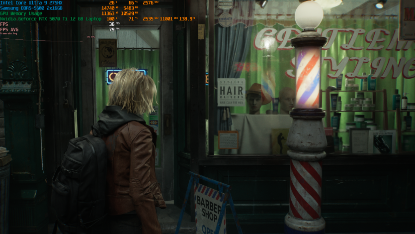 Запустивши Resident Evil Requiem, і обравши пресет DLSS Quality + MFG X4, маємо 136 FPS на десктопі та 103 FPS на ноутбуці. Для мобільної 5070 Ti це сценарій, який робить 4K реалістичним, а не номінальним режимом.
