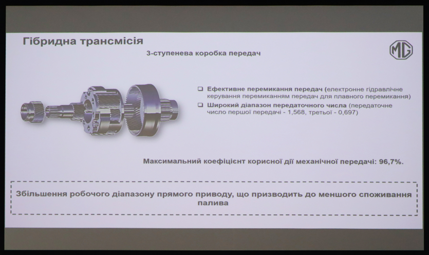 Кульмінацією системи є тришвидкісна гібридна трансмісія EDU з планетарними редукторами. Три передачі (знижена, пряма, підвищена) дозволяють системі працювати то як послідовний, то як паралельний гібрид залежно від умов. Вісім пресетів роботи – це як вісім різних персон автомобіля. Середня ефективність системи – 96,7 відсотків. Звучить навіть краще, ніж у Toyota Yaris Cross, який традиційно береться за взірець економічності. Детальніше ми вже розповідали в матеріалі після технічного ретельного знайомтсва з MS ZS Hybrid+.