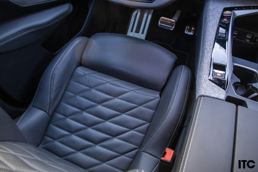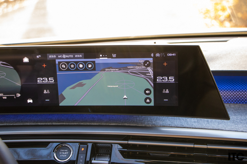 Матеріали в GT – окремий вид тактильного задоволення. Алькантара Greval Grey на дверних картах і торпедо — це так затишно, що хочеться торкатися її постійно. Ніякого дешевого глянсового пластику, який збирає відбитки пальців, як у корейців. Тут все матове, шляхетне. А тепер тут і фірмова додаткова сенсорна панель з персональними налаштуваннями іконок під екраном. Пару кліків і завжди всі бажані функції під рукою від масажу в кріслах, підігрівів та вентиляції сидінь і керма, трьохзонного клімату, підігріву лобового скла і до навігації, яка тут синхронізована з Waze. Так дійсно, штатна навігація показує пробки та камери автофіксації прямо на приладовій панелі. Жодного шансу вляпатись в неприємності.