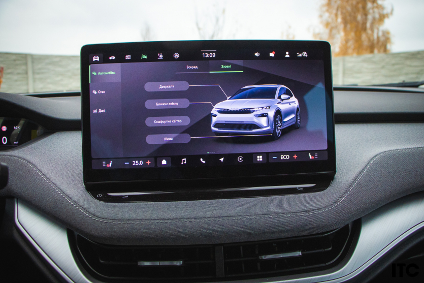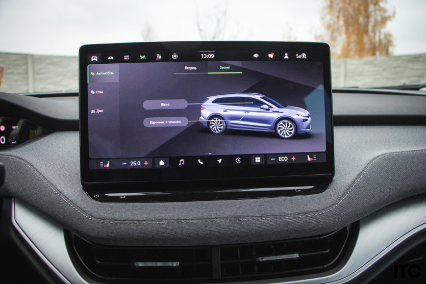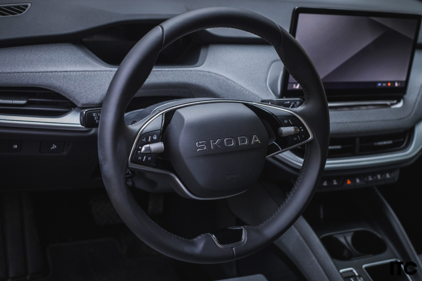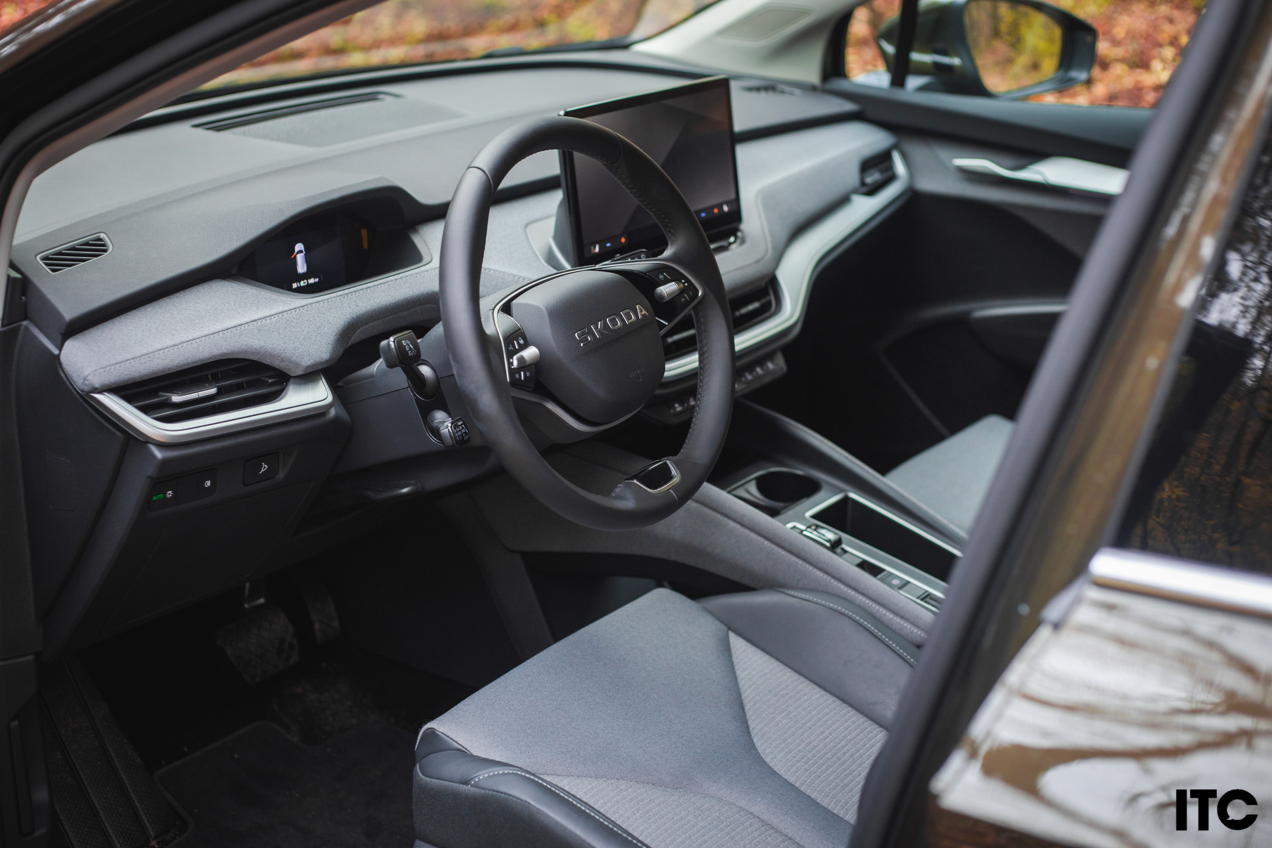 Знайоме двоспіцеве кермо, великі дзеркала, простір під ногами, цікаве оформлення ручок дверей – все прораховано так, щоб ти сів наче у вже знайому машину. Це все так схоже на інші моделі Skoda, однак взагалі інакше в загальному стилі. Ось навіщо зробили кнопку запуску двигуна, якщо вона сама запускається, як тільки ти вмостився на кріслі та натиснув гальма або клацнув клавішу драйву. Здається все, як в найкращій уяві де технології зібрані в єдине ціле від безключового доступу до підсвітки доріжки до дому та проєкції логотипа тобі під ноги, якби машина не вимикалась кожного разу, як ти вийдеш ворота відчинити або пробити талон паркування.