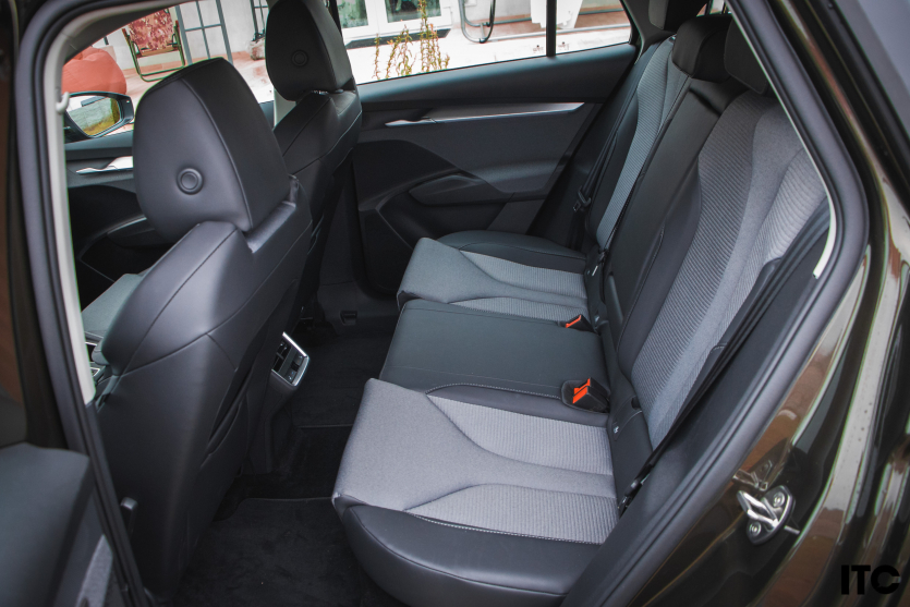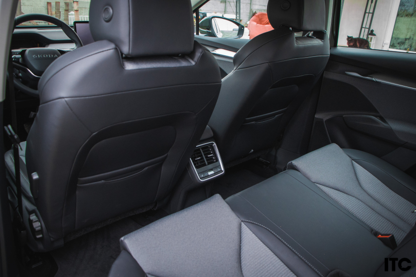 Позаду Škoda Enyaq 2025 місця вистачить навіть трьом, але сидіти в середині трохи незручно через особливість крісла, зате немає під ногами центрального тунелю, а Skoda може запропонувати цікаві органайзери в цю зону. Окремий екранчик виведено для клімату, щоб пасажири відчували приналежність до технічної революції. Звичайно тут є і підлокітник і складання тільки середньої частини спинки, що утворює люк в багажник та дозволяє перевезти карниз на дачу або лижі під час подорожі на зимовий курорт, якщо вистачить сміливості.