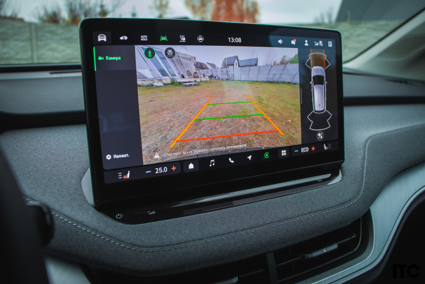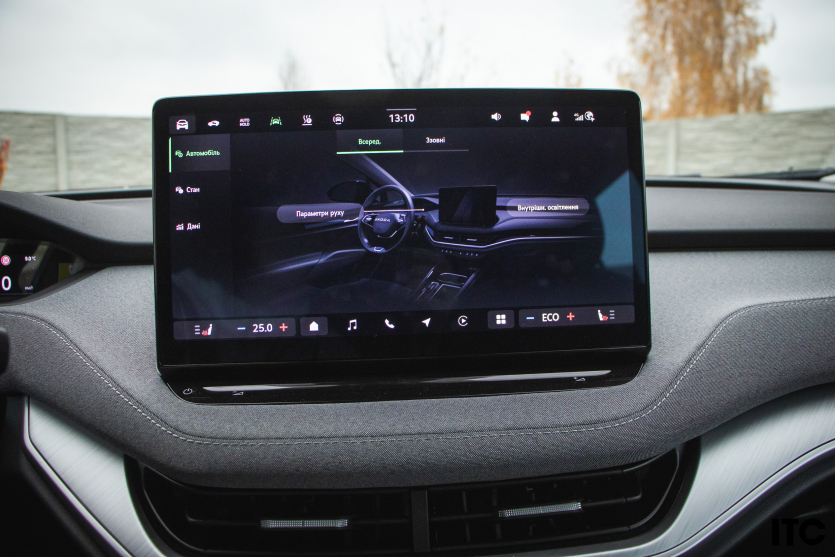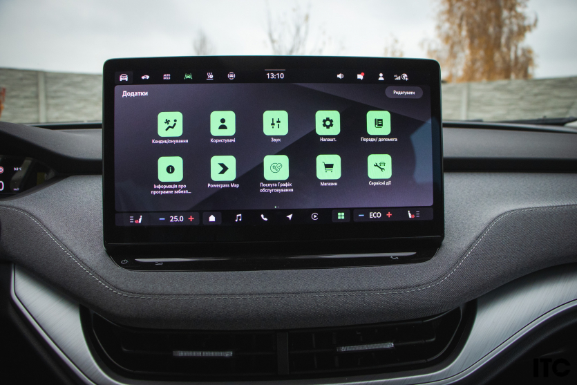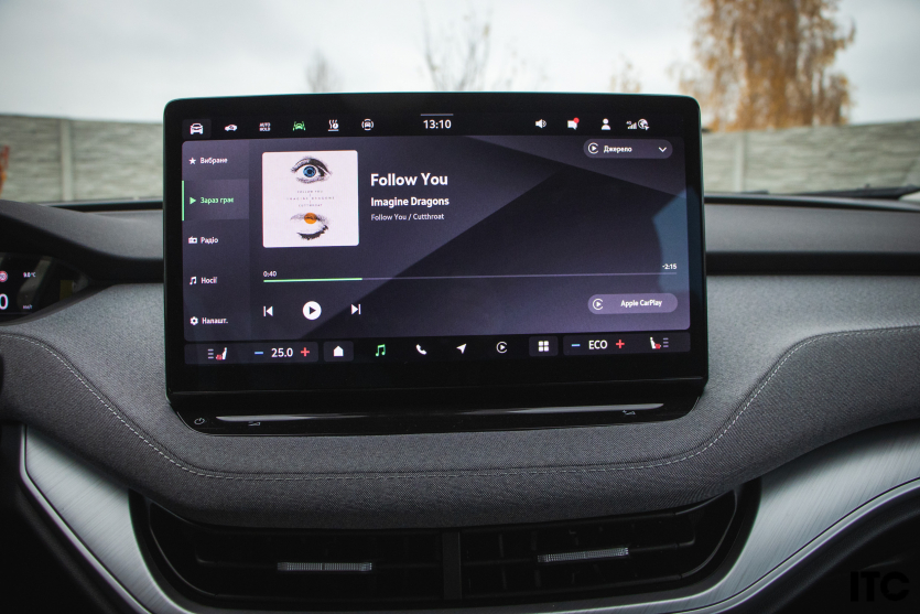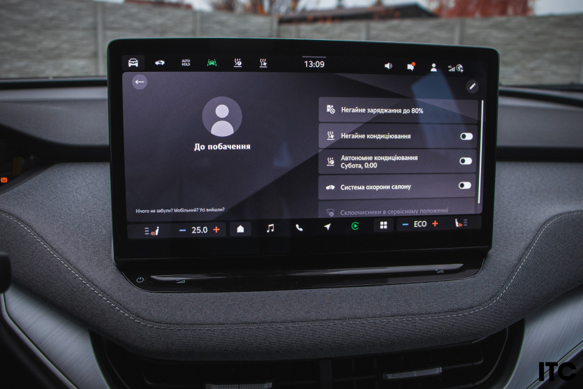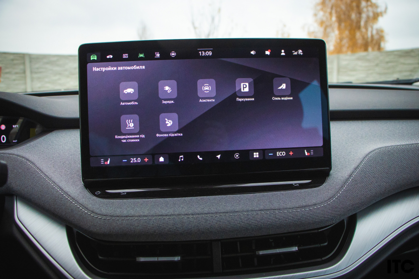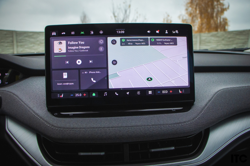 Здається відсутність топових функцій майже не торкається атмосфери в салоні. Відсутність електрорегулювань крісел, бездротової зарядки – це не критичні моменти і на загальне враження вони не впливають. Тут є все для задоволення та практичності: 13-дюймовий монітор зі швидкою мультимедією, бездротове підключення смартфона, трьохзонний клімат, підігріви керма та чотирьох крісел.