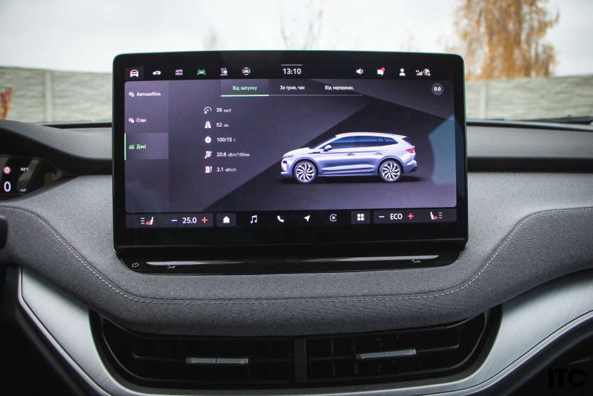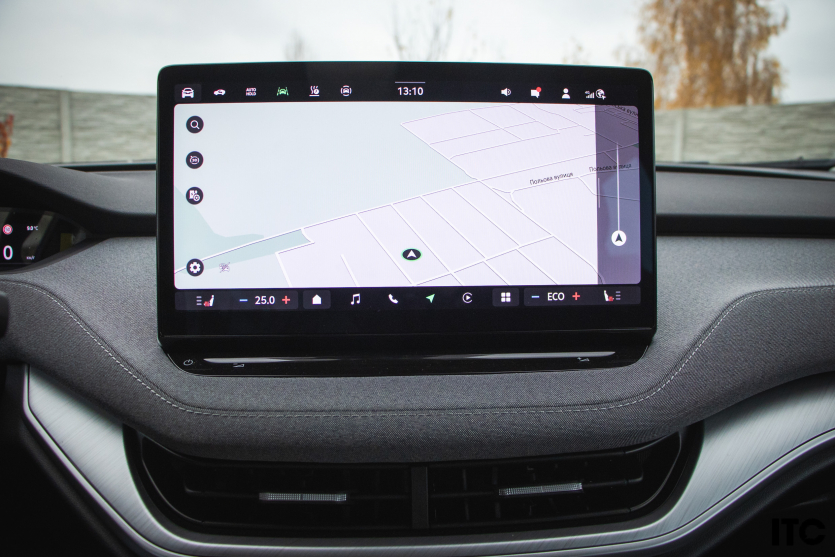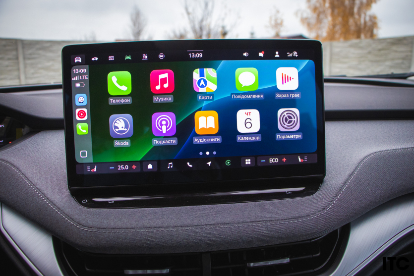 Трохи бентежить цей дрібний екран приладової панелі. Він показує достатньо інформації, щоб слідкувати за станом авто, швидкістю, витратою та іншими показниками. Однак тут однозначно не вистачає проєкційного дисплея, який доповнив би картину. Тим паче зараз Skoda пропонує проєкцію 3D не гірше ніж в Audi.