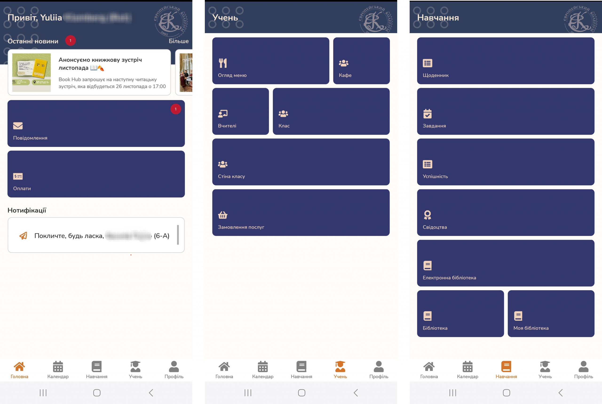 Пам’ятаю випадок, коли батьки не прийшли на важливу зустріч, бо лист був у вкладенні до вайбер-повідомлення, яке загубилося серед десятків інших. Саме тоді ми зрозуміли: треба змінювати все системно. Так з’явився наш застосунок. Тепер оцінки та домашні завдання, розклад і важливі оголошення, електронна бібліотека, замовлення меню в їдальні, рахунки й оплата знаходяться в одному місці.