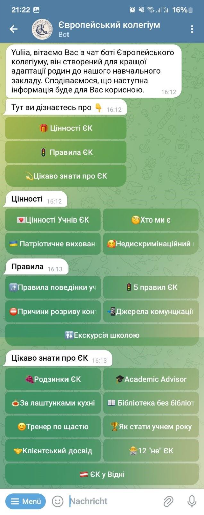 У чат-боті можна ознайомитися із цінностями і правилами школи. Він відповідає на часті запитання, дає доступ до корисної інформації, яка не відображена на сайті, адже орієнтована саме на ті родини, які вже підписали контракт зі школою.