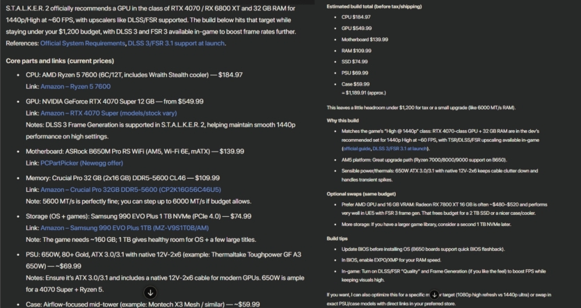 Як бачимо, у Chat GPT для американського ринку вийшло значно цікавіше, хоча й була одна помилка у посиланні на відеокарту NVIDIA GeForce RTX 4070 Super. Добре, що він не порадив відеокарти 5000-ї серії з восьмигіговим об’ємом відеопам’яті.