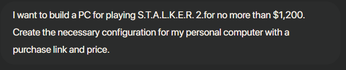І ось я подумав: чим не жартує біс, а може дійсно щось добре придумали в EZ PC Builder і вирішив спробувати підібрати недорогий (по нинішнім міркам) комп’ютер, щоб пограти у S.T.A.L.K.E.R. 2. Чому саме його? По-перше — це гра від українських розробників, а по-друге — вона досить вимоглива.