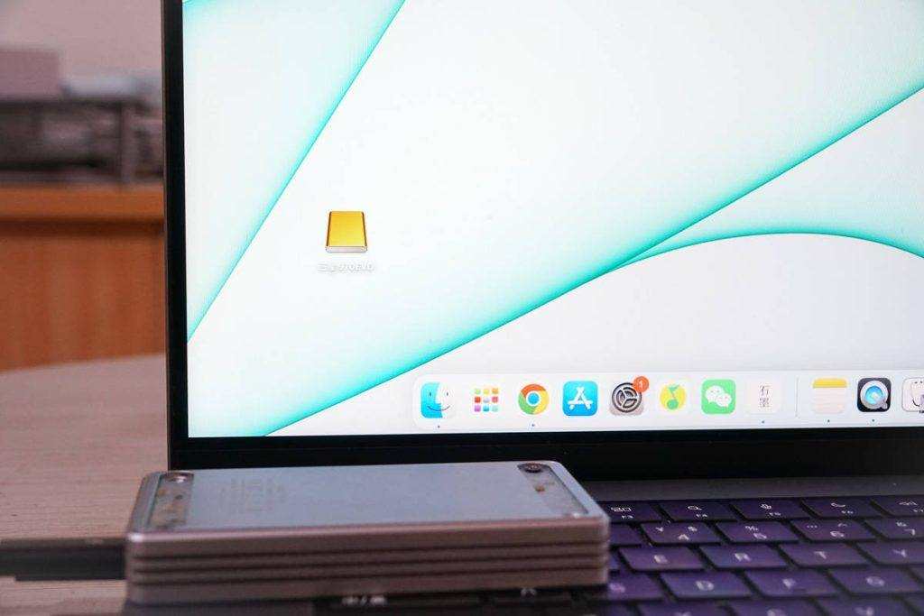Приєднайте кабель до порту USB-C до MacBook Pro та до корпусу жорсткого диска Acasis Thunderbolt, у якому розміщено SSD Samsung 970evo. Як бачите, тепер жорсткий диск успішно зчитується з робочого столу, що означає, що кабель підтримує передачу даних.