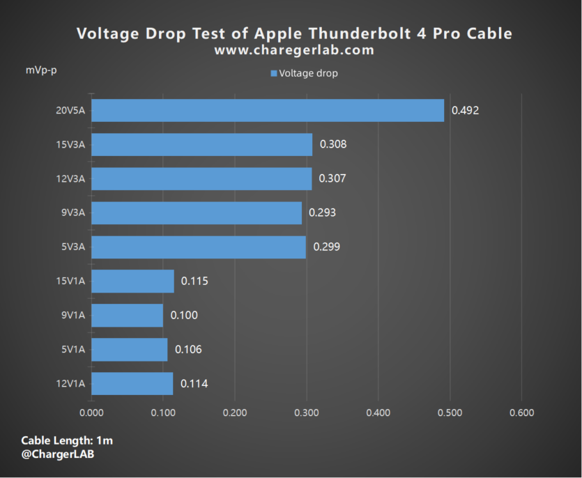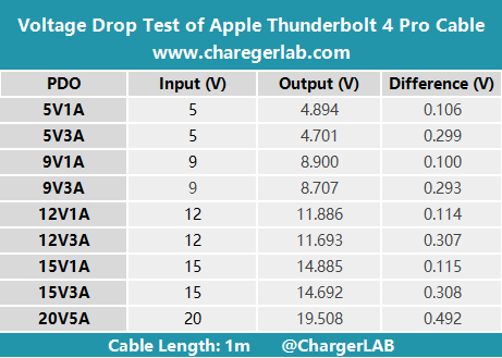 Тести показали, що кабель Thunderbolt 4 Pro (1 м) підтримує швидке заряджання, силу струму до 5 А і потужність до 100 Вт. Але з цим кабелем тільки зарядний пристрій Apple може забезпечити швидке заряджання потужністю 100 Вт. Інші зарядні пристрої тимчасово підтримують лише потужність 60 Вт.