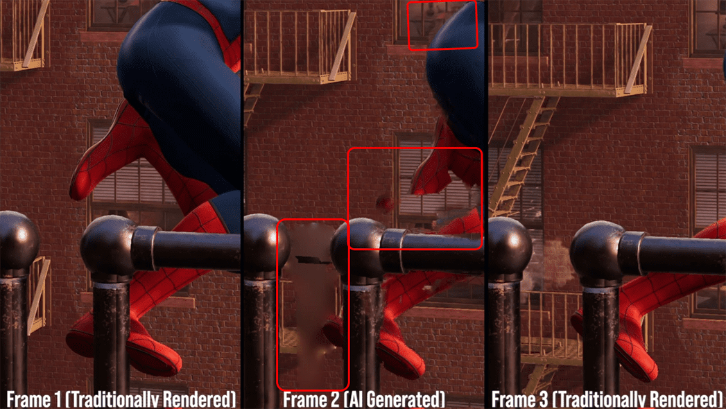 Окрім затримки, генерація кадрів створює візуальні артефакти. На високих частотах кадрів (80+ FPS базових) їх майже не помітно – все відбувається так швидко, що очі не встигають зафіксувати недоліки. Але при 30 базових FPS артефакти стають очевидними.