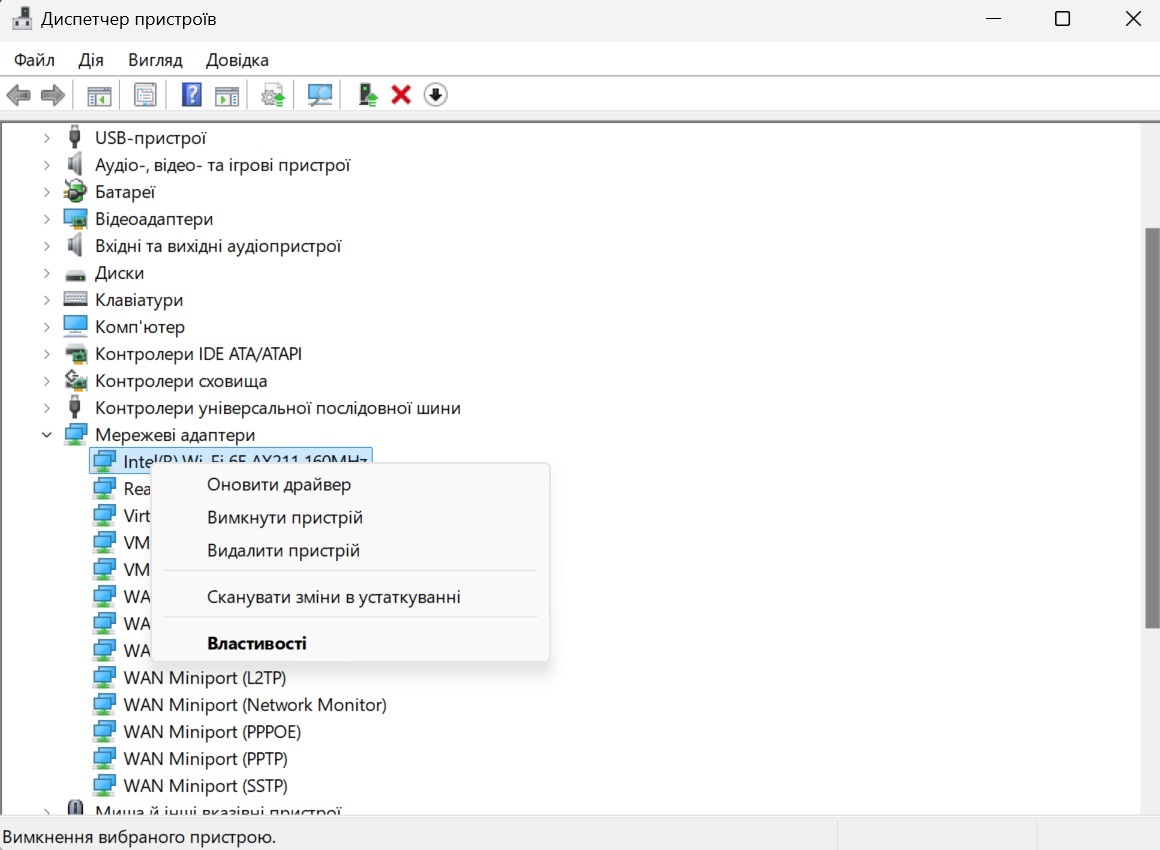 У Диспетчері пристроїв вимикаємо й вмикаємо неробочий пристрій. Це один з кроків, який рекомендують зробити в інтернеті, й існує ймовірність що це дійсно спрацює.