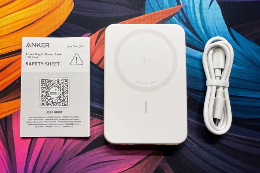 Anker MagGo Power Bank 10K Slim постачається у простій фірмовій коробці. Пакування, як зазвичай у Anker, мінімалістичне, але впізнаване, із зазначенням моделі та назви продукту. Всередині є сам повербанк, інструкція з безпеки (посібник користувача доступний онлайн) і кабель USB-C – USB-C. У моєму випадку це була біла версія, тому й кабель теж білий. Можна припустити, що чорний варіант постачається з чорним кабелем, а от щодо рожевого й зеленого — не впевнений.