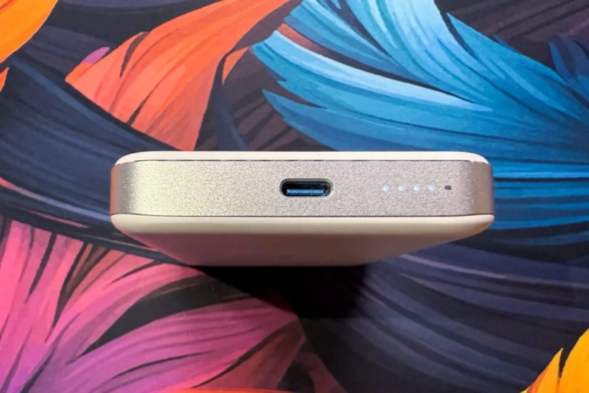 MagGo Power Bank 10K Slim має елегантний дизайн із алюмінієвою рамкою. Цей акцент мені дуже сподобався, хоча через металевий корпус акумулятор трохи важчий, ніж деякі інші моделі. На боковій грані розташована кнопка живлення, яка вмикає світлодіодні індикатори поряд із портом USB-C. Усього п’ять індикаторів: чотири показують рівень заряду, а п’ятий вмикається, коли пристрій заряджається від мережі.