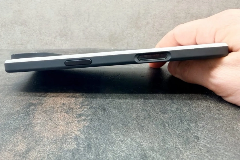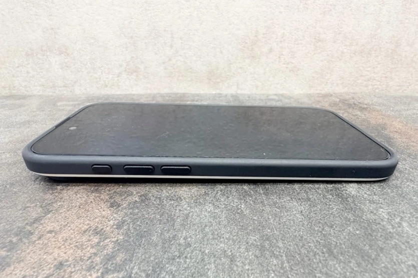 Я опустив підвісний язичок і висунув внутрішній чорний лоток з основної упаковки. З нього я дістав чохол. Після цього я вийняв картонну вставку з чохла, прочитав короткий текст і встановив iPhone 17 Air в чохол. На лівій боковій грані розміщені кнопка дії розміром та дві кнопки гучності. Права сторона має кнопку живлення та виріз для кнопки камер, доповнений захисною накладкою від подряпин. На нижній грані передбачено виріз для USB-C та два отвори для динаміків.