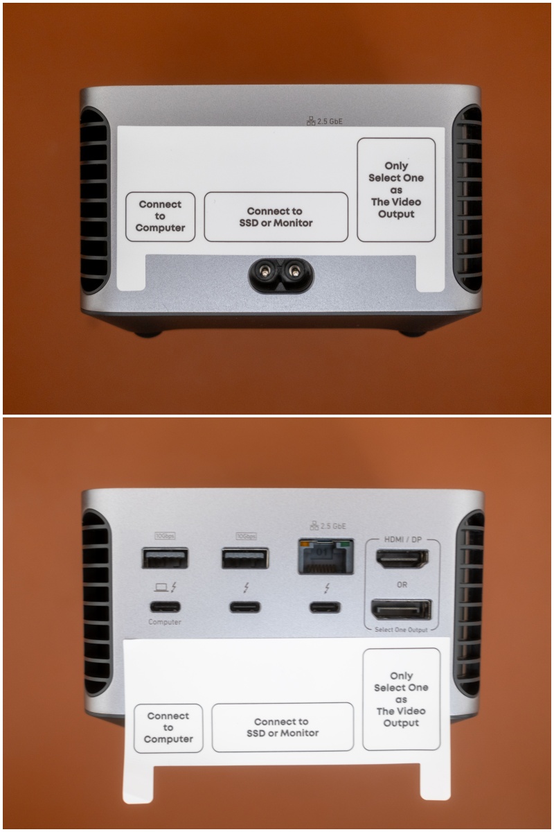 Монтаж не потрібен. Просто підключіть тонкий кабель живлення — окремого великого блока немає. Потім під’єднайте кабель Thunderbolt 5 до upstream-порту док-станції та до порту TB5 на комп’ютері.