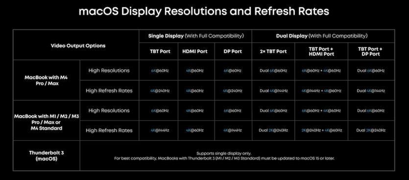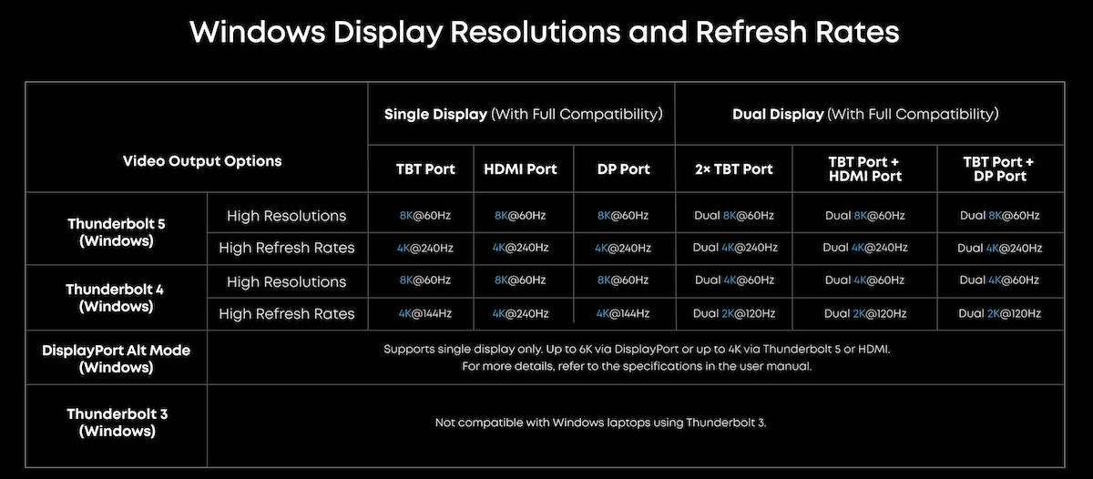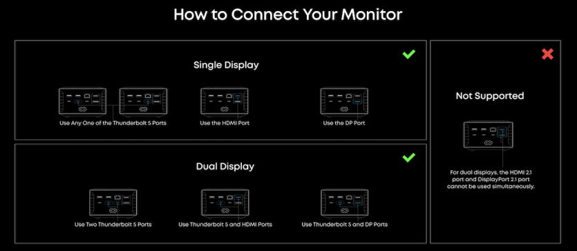 Однією з ключових функцій Anker Prime TB5 є підтримка кількох моніторів високої роздільності. На сайті Anker є таблиці й схеми підключень — вони чітко показують можливі конфігурації для Windows і Mac.