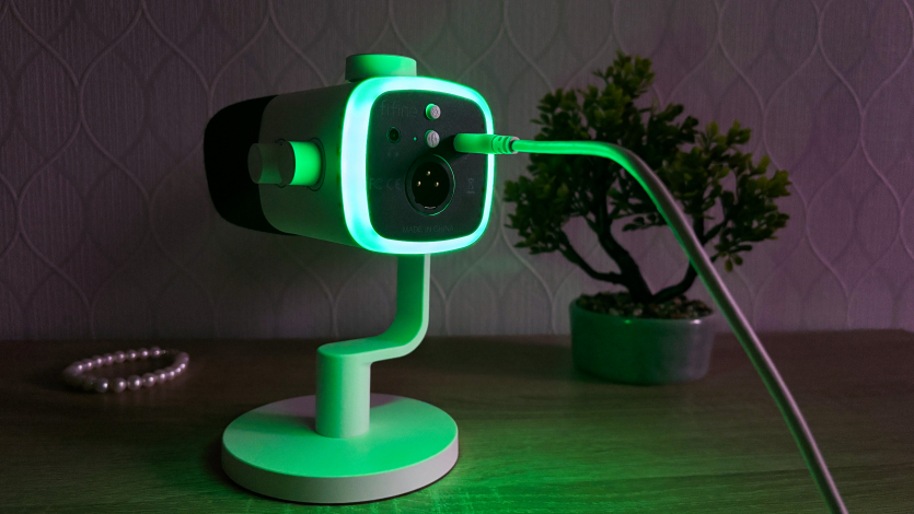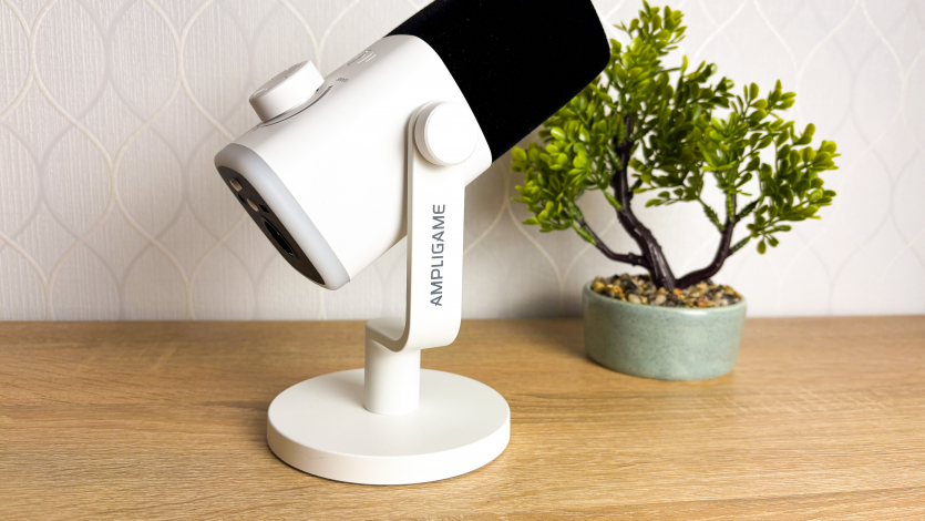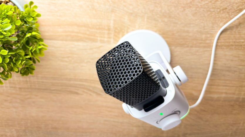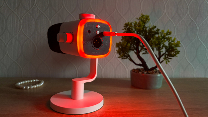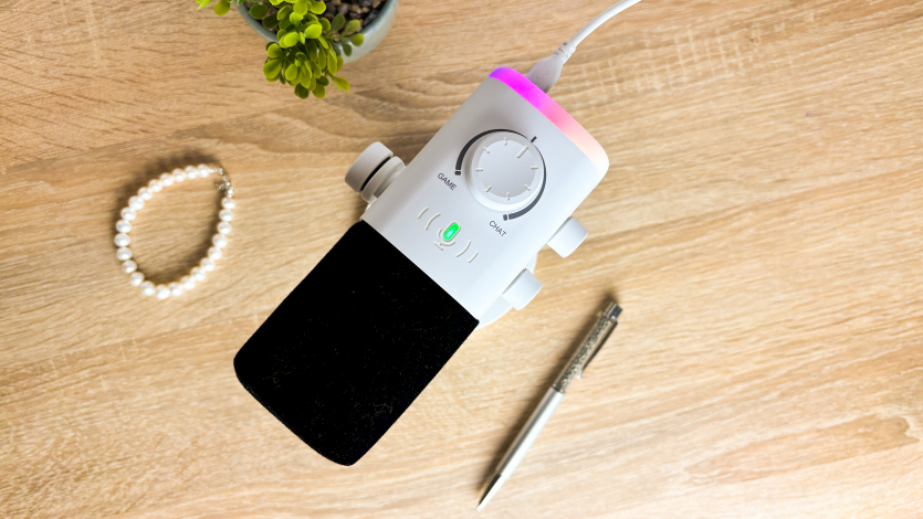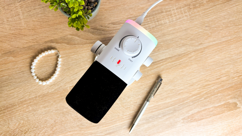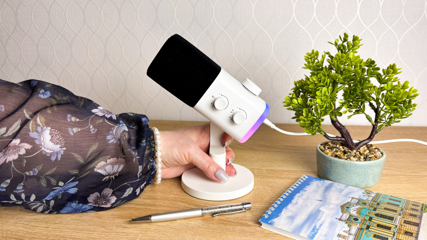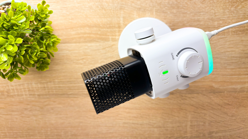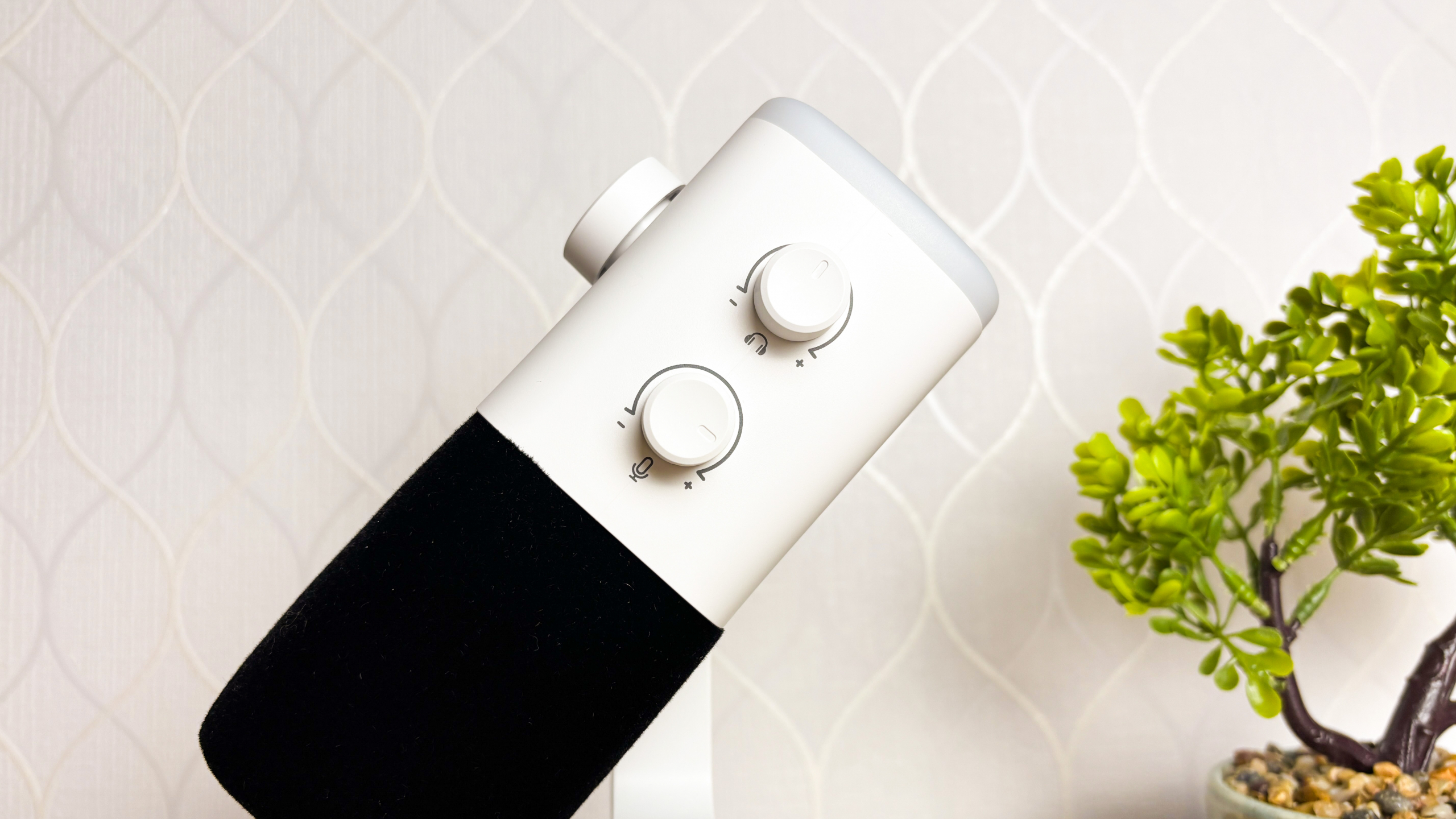 На передній частині Fifine AM9 розмістили сенсорну клавішу увімкнення/вимкнення мікрофона зі світлодіодною індикацією та великий регулятор для визначення точного балансу між звуком гри та голосовим чатом. На лівій стороні бачимо дві крутилки: верхня відповідає за гучність мікрофона, тоді як нижня необхідна для контролю вашого голосу під час запису.