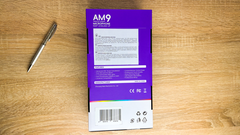Fifine AM9 отримав прямокутний дизайн із закругленими кутами. Корпус мікрофона пластиковий, місце кріплення до стійки чи пантографа металеве. Капсуль, який доречі також металевий, захований під поролоновим попфільтром. На нижній частині бачимо зону з RGB-підсвічуванням.