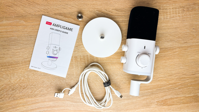 Fifine AM9 постачається у відверто немаленькій та яскравій коробці. Всередині неї знайдемо героя огляду у білому кольорі, круглу пластикову підставку з силікованою прокладкою для розміщення мікрофона на столі, інструкцію по підключенню та базовим налаштуванням, кабель USB-C to USB-C/USB-A довжиною 2 м та перехідник 5/8″ на 3/8″. Останній необхідний у випадку встановлення Fifine AM9 на пантограф.