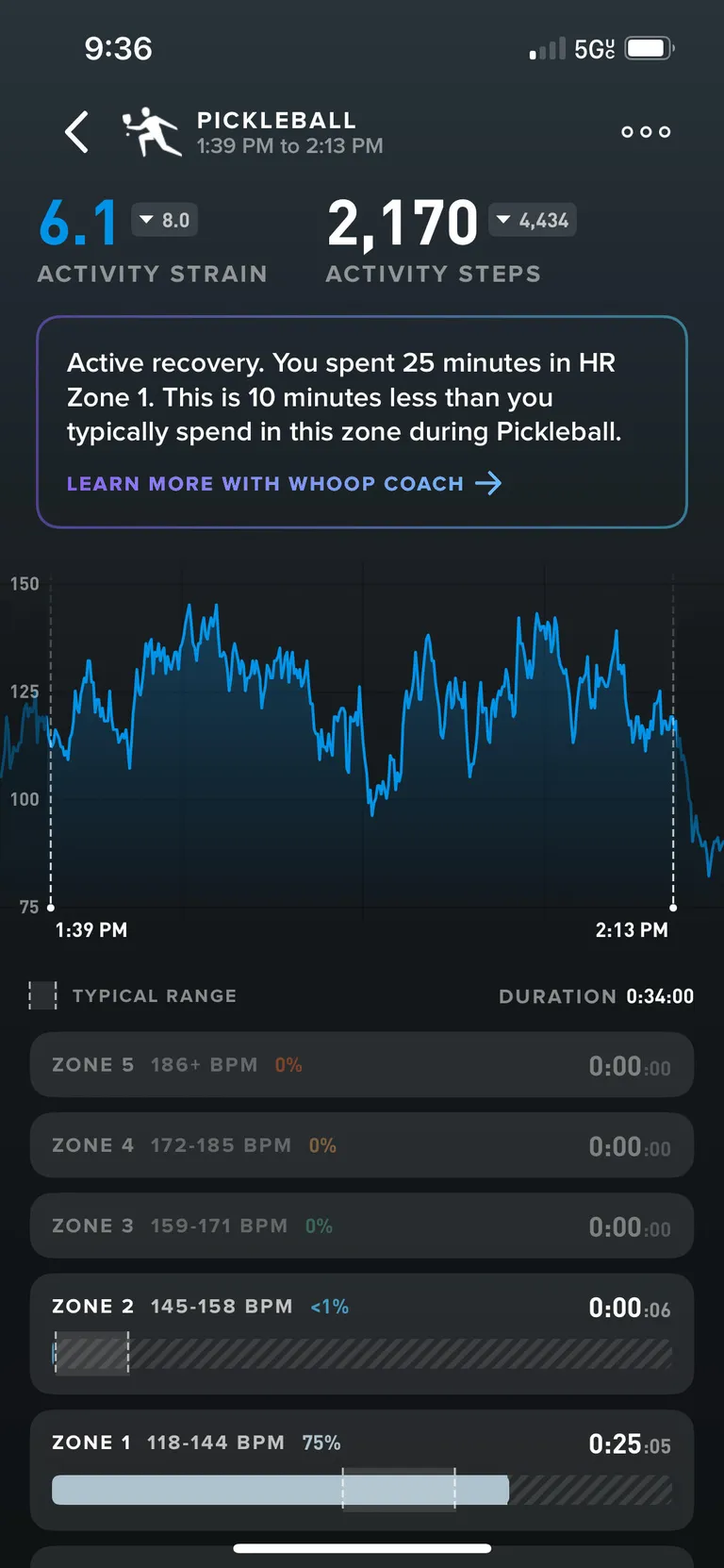 Підписка Whoop One забезпечує повний набір біометричних показників, включно з моніторингом пульсу, VO₂ Max, фаз сну, щоденною активністю, кроками та автоматичним визначенням типу тренування. Алгоритми Whoop формують оцінку відновлення й рівень навантаження (strain score) — на основі серцевого ритму, варіабельності пульсу (HRV) та якості сну. У дні, коли тіло повністю відновилось (зелені дні), Whoop радить тренуватися інтенсивніше; у червоні дні рекомендує знизити навантаження.