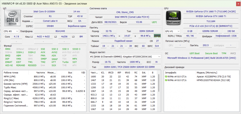 По суті, єдиний апгрейд, який пройшов у Acer Nitro 5 без особливих проблем, не враховуючи одного блюскріна і 2-х підозріло довгих перезавантажень, – це заміна оперативної пам’яті, з 16 на 32 ГБ. При цьому варто зазначити, що пам’ять запрацювала на повільніших таймінгах, ніж прописані у SPD модулів: