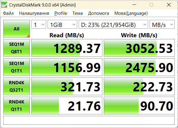 Швидкодія NVME дисків приходить в норму, ось результат для Apacer AP2TBAS2280P4UPRO-1: