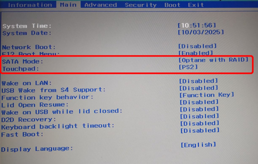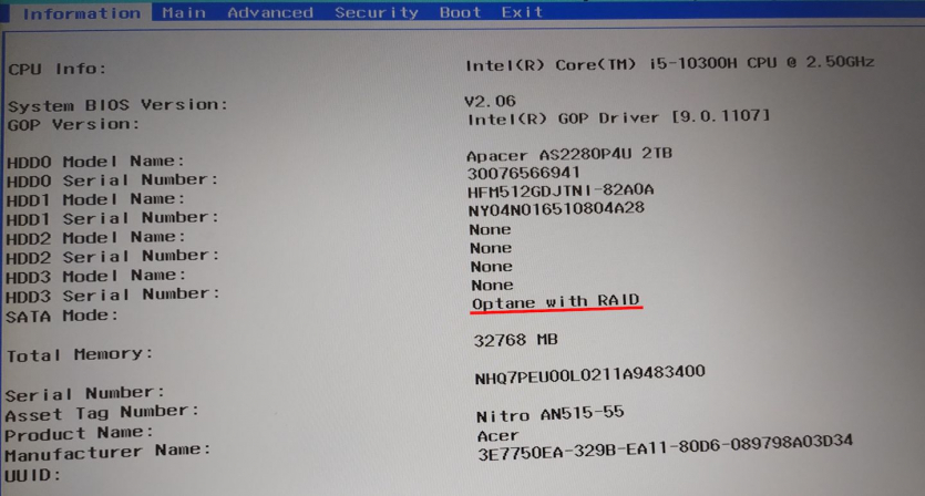 Режим роботи SATA був помічений як OPTANE with RAID. Дуже дивний вибір опції за умовчанням, м’яко кажучи! Хоча ніяких SATA дисків в ноутбуці не було, саме ця опція, на мою думку, могла опосередковано зачіпати режим роботи NVME. Однак, саме цікаве було у тому, що перелопативши BIOS, я так і не знайшов де змінюється відповідна опція меню!