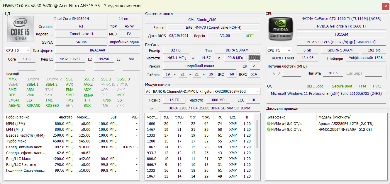 «Долати труднощі» ми будемо на прикладі модернізації ноутбука Acer Nitro 5 AN515-55-56WH наступної конфігурації: