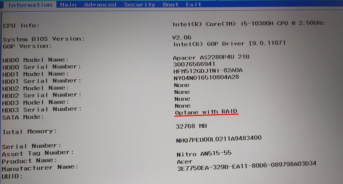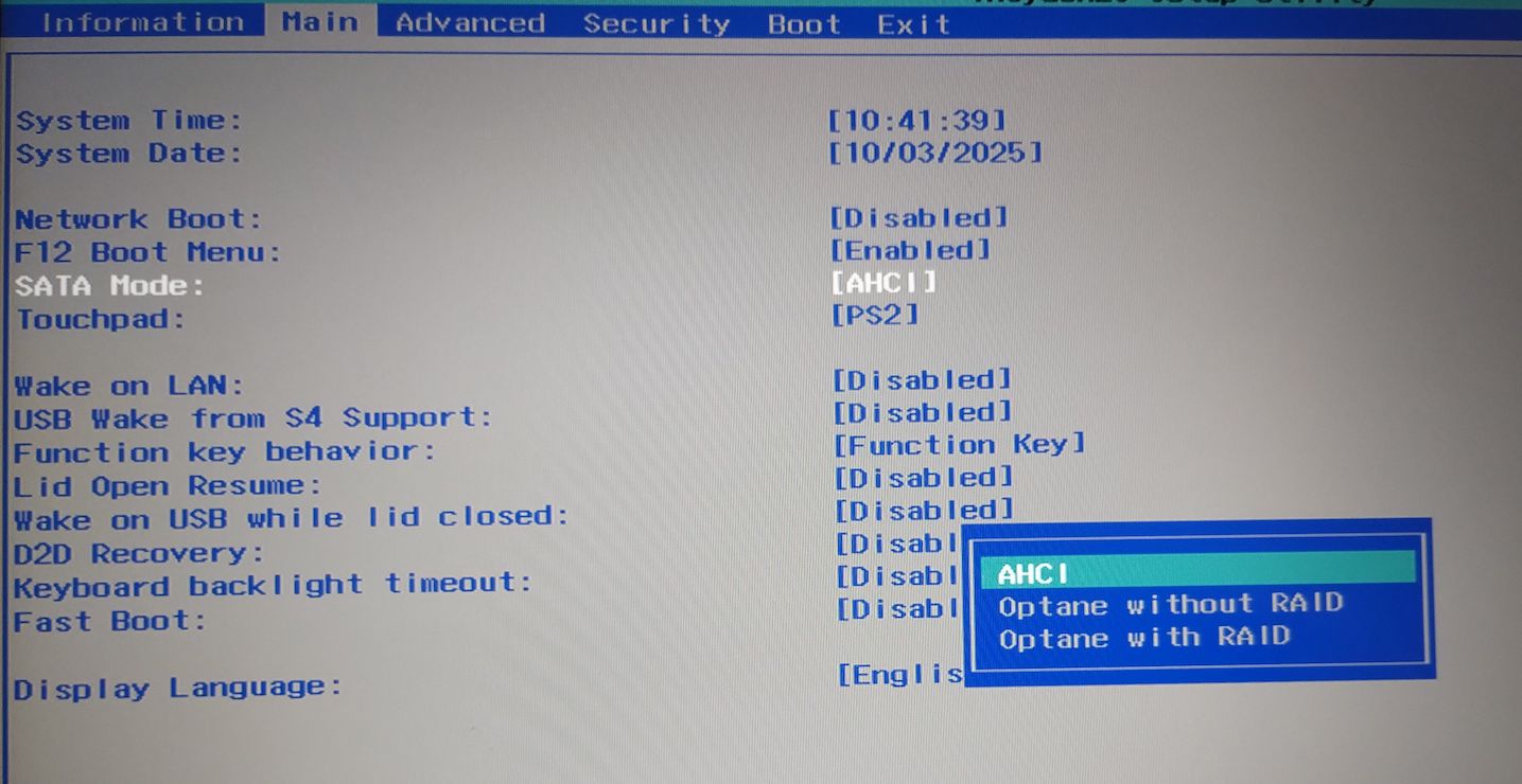 Режим роботи SATA був помічений як OPTANE with RAID. Дуже дивний вибір опції за умовчанням, м’яко кажучи! Хоча ніяких SATA дисків в ноутбуці не було, саме ця опція, на мою думку, могла опосередковано зачіпати режим роботи NVME. Однак, саме цікаве було у тому, що перелопативши BIOS, я так і не знайшов де змінюється відповідна опція меню!