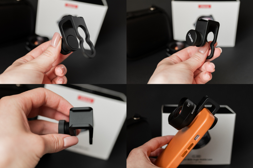 Кріплення тут максимально просте, але в цьому і плюс. Лінза ставиться через фіксатор з гвинтом, який затискається на телефоні. Тримається він добре, не з’їжджає під час зйомки (лише якщо сильно зачепити). Я пробувала і з чохлом, і без — різниці взагалі не відчула, все фіксується однаково добре.