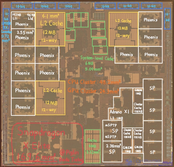 Процесор Snapdragon X Elite оснащений 12 кастомними ядрами Oryon (8 продуктивних і 4 енергоефективних), що пояснює більший розмір CPU-кластера — 48,2 мм², на 78% більше, ніж у M4. Проте графічний процесор Adreno X1 займає лише 24,3 мм², що на 25% менше за графіку M4.