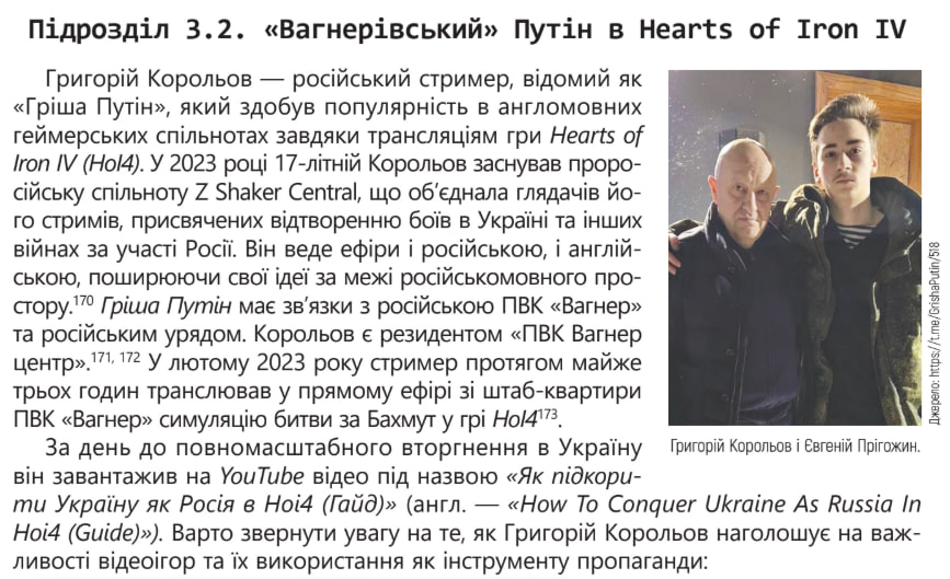 Стримери не відстають від тенденцій. Кожного немає сенсу перераховувати, бо їх багато, але дослідження навело приклад з “Грішою путіним”. Хлопець здобув популярність завдяки трансляціям гри Hearts of Iron IV. У 2023 році він створив спільноту Z Shaker Central, де відтворює бої в Україні та інші конфлікти за участі росії, транслюючи це російською й англійською мовами. А ще він має зв’язки з ПВК “Вагнер” й є резидентом їхнього медіацентру. Він навіть стрімив симуляцію битви за Бахмут прямо зі штаб-квартири “Вагнера”, а напередодні вторгнення публікував гайд “Як підкорити Україну як Росія в HoI4”. Та і сам хлопець відкрито говорить про роль ігор як засобу пропаганди.