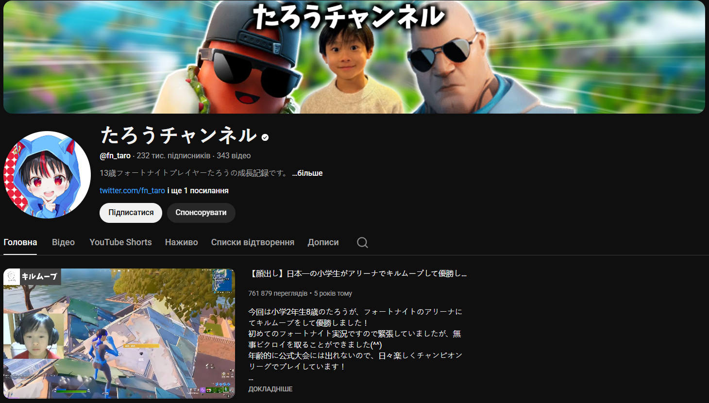 Така історія, звичайно, не пройшла непоміченою для користувачів. Історія стосується хлопчика під ніком Tarou, який занурився у світ відеоігор з трьох років. Він зараз веде популярний канал з 230 тис. підписниками і активно випускає відео по Fortnite. Та і вже встиг заявити про себе у кіберспорті.
