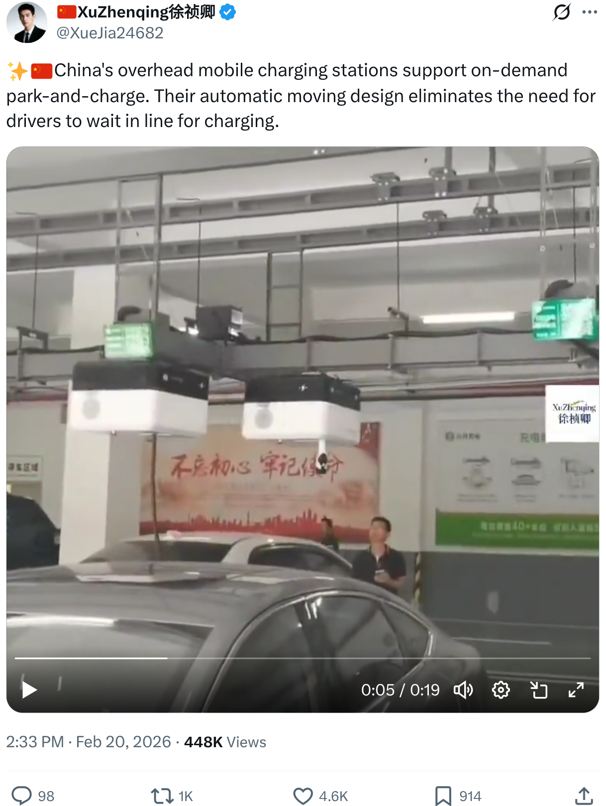 Йдеться про систему, яка перетворює паркомісце на зарядний хаб без встановлення окремих зарядних пристроїв. Відео було опубліковане у соцмережі Х 20 лютого. Система працює через стельовий роботизований зарядний пристрій, що переміщується вздовж надземної рейки, встановленої в паркінгах. Виконуючи роль як каналу живлення, так і траєкторії руху, рейка дозволяє пристрою пересуватися до будь-якого паркомісця, яке вона обслуговує. Водії можуть запросити заряджання через мініпрограму WeChat або QR-код, після чого робот прямує до автомобіля, визначає розташування зарядного порту за допомогою камер і сенсорів та автоматично підключає штекер.