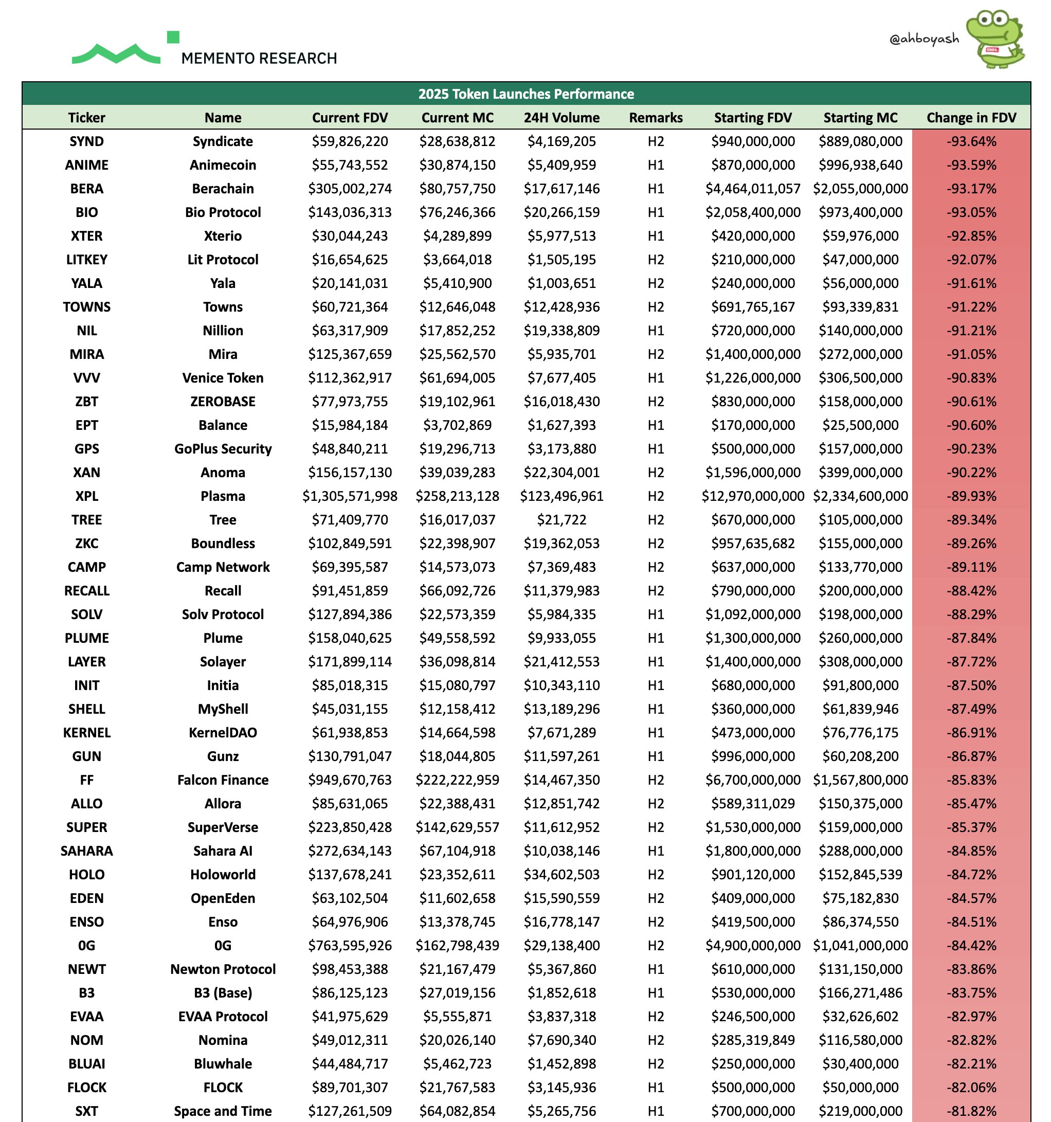 TGE (Token Generation Event) — це первинний запуск токена на ринок, момент, коли актив уперше стає доступним для інвесторів і формується його початкова оцінка. Саме цю стартову ціну та пов’язану з нею повністю розбавлену оцінку (FDV) дослідники взяли за базу для порівняння з поточними показниками.