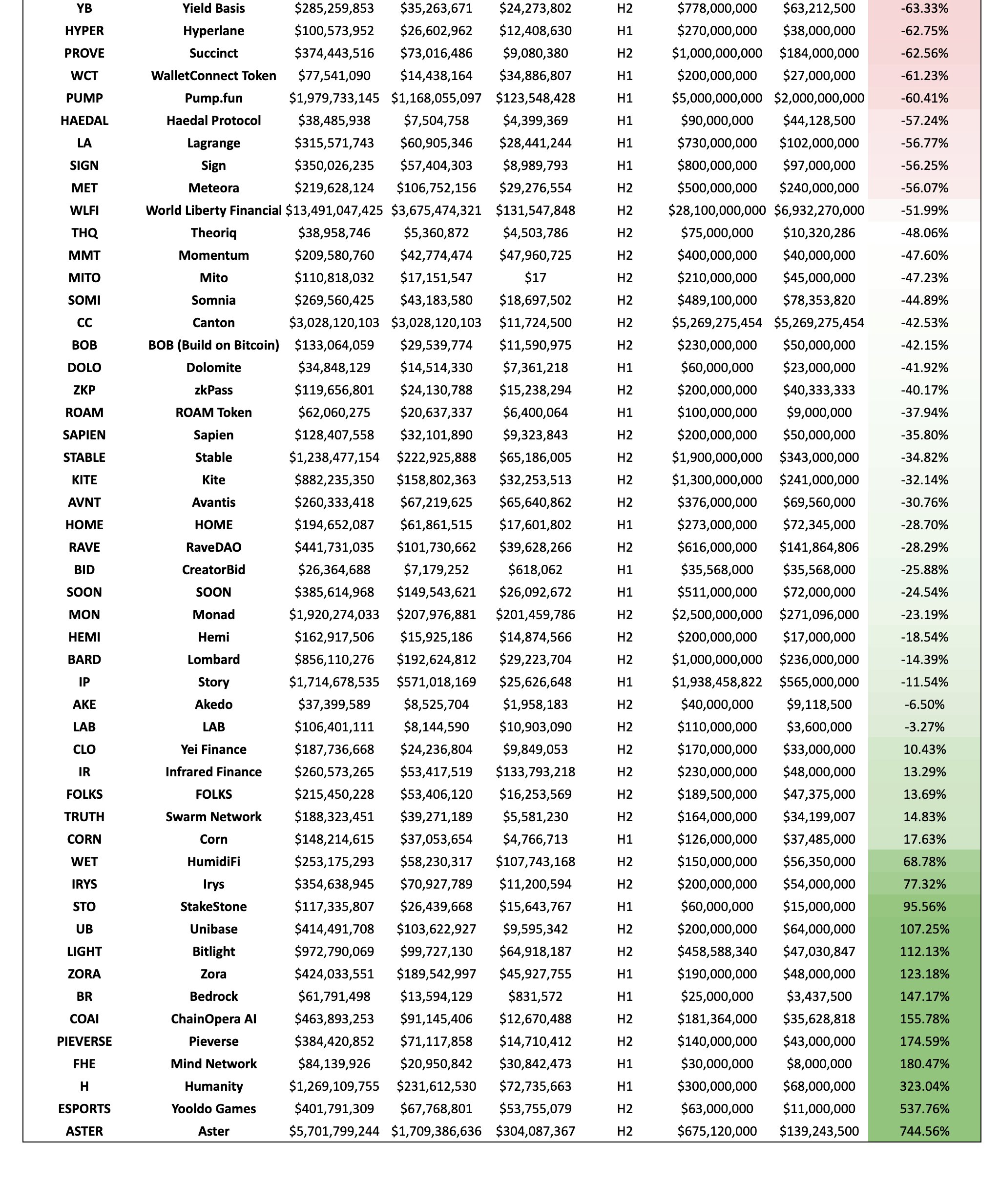 На цьому тлі контрастно виглядають поодинокі успішні кейси. Найкращу динаміку показав Aster, який зріс більш ніж у сім разів від стартової оцінки. У значному плюсі також Humanity, Mind Network, ChainOpera AI, Bedrock і Zora. Саме ці проєкти сформували вузьку групу винятків, на яких і тримається позитивна частина статистики року.