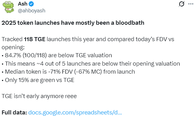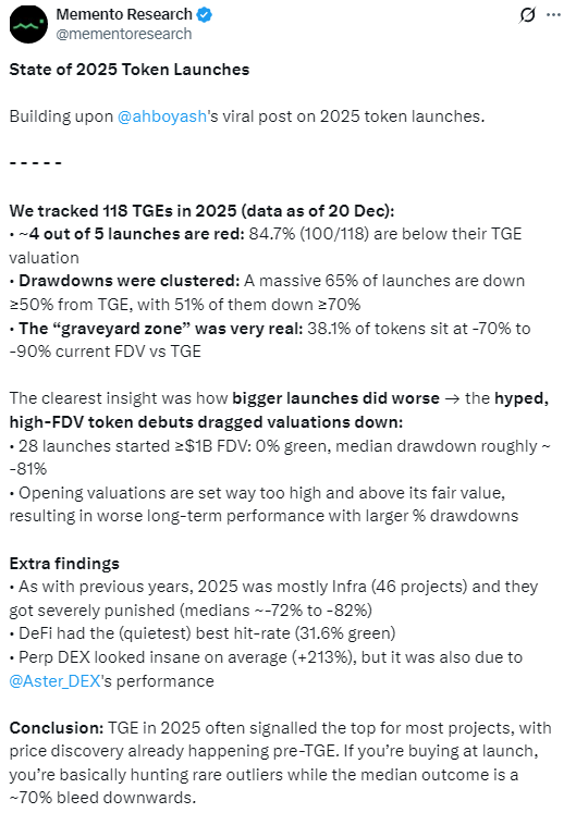 За даними Memento Research, 2025 рік виявився невдалим для більшості нових монет. Із 118 проєктів, що пройшли TGE, 100 токенів торгуються нижче стартової ціни. Лише 15% запусків змогли втриматися в плюсі.