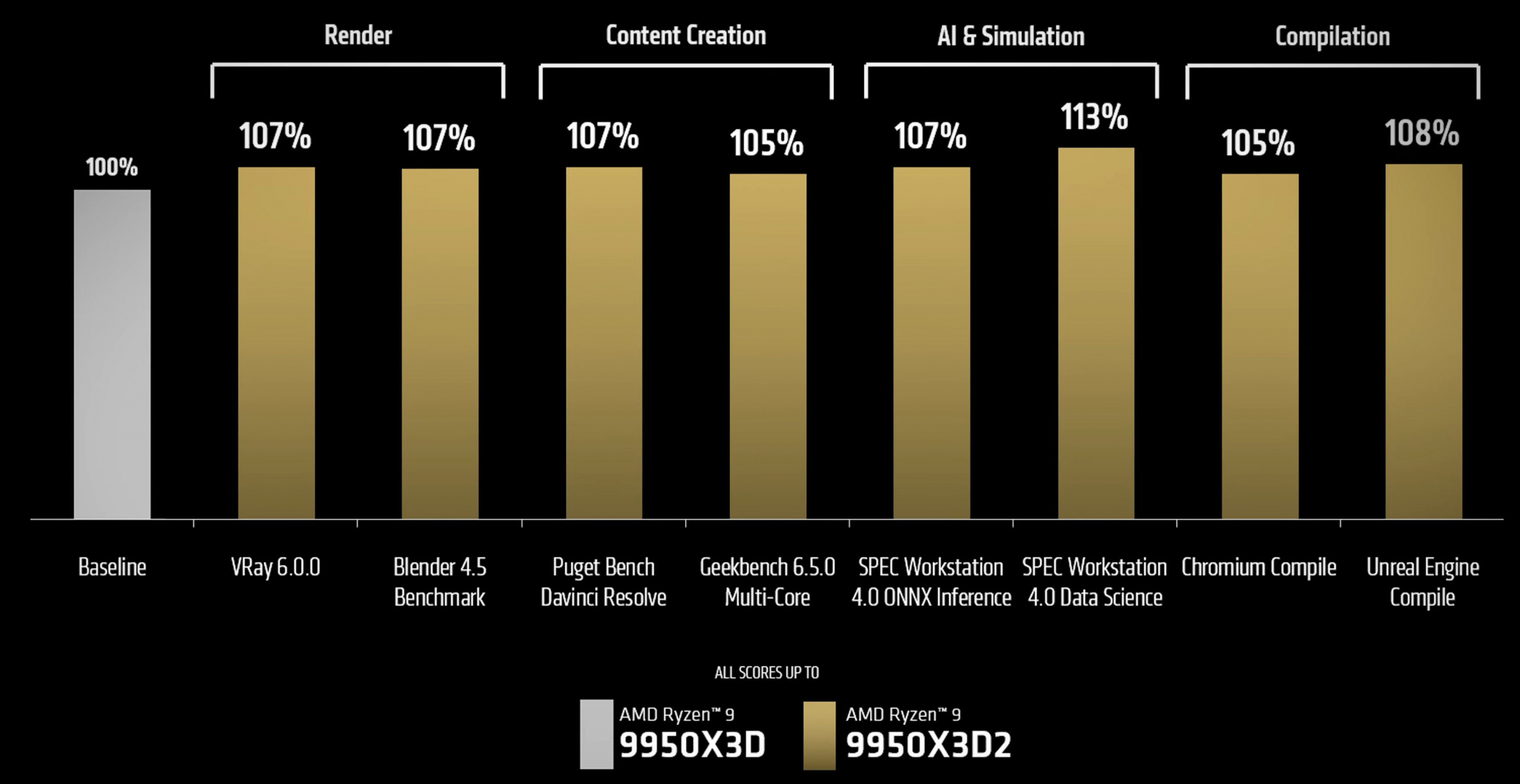 За даними AMD, новий Ryzen 9 9950X3D2 забезпечує зростання продуктивності на 5-10% у порівнянні з Ryzen 9 9950X3D при виконанні творчих навантажень, зокрема DaVinci Resolve, Blender, а також під час масштабних збірок вихідного коду, як-от Unreal Engine і Chromium. Також більший обсяг кешу повинен забезпечити кращу продуктивність в іграх.